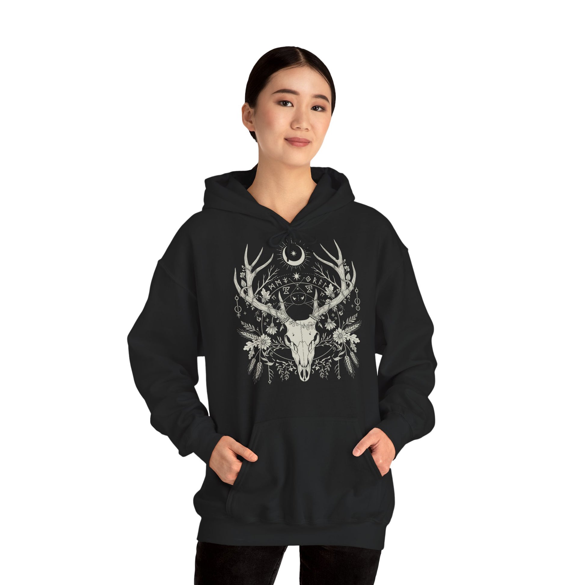 Dompel jezelf onder in mystieke duisternis met ons exclusieve ontwerp "The Silent Ritual of the Stag" . Geïnspireerd door illustraties uit oude grimoires en de esthetiek van duistere volkskunst , vangt dit beeld de dualiteit van leven en dood door middel van een majestueuze hertenkop, subtiel verweven met wilde bloemen en alchemistische symbolen. De essentie van Folk Horror in je garderobe.