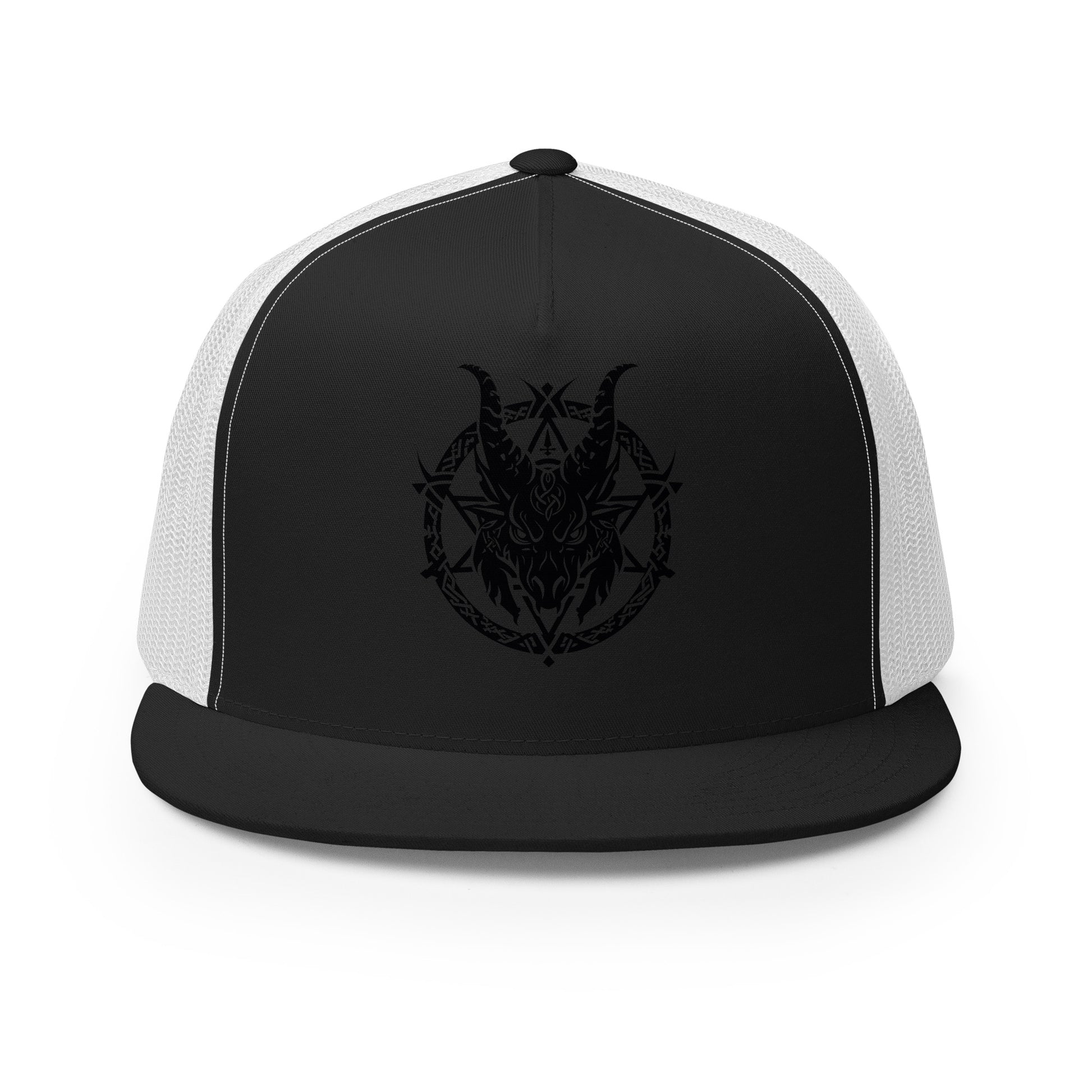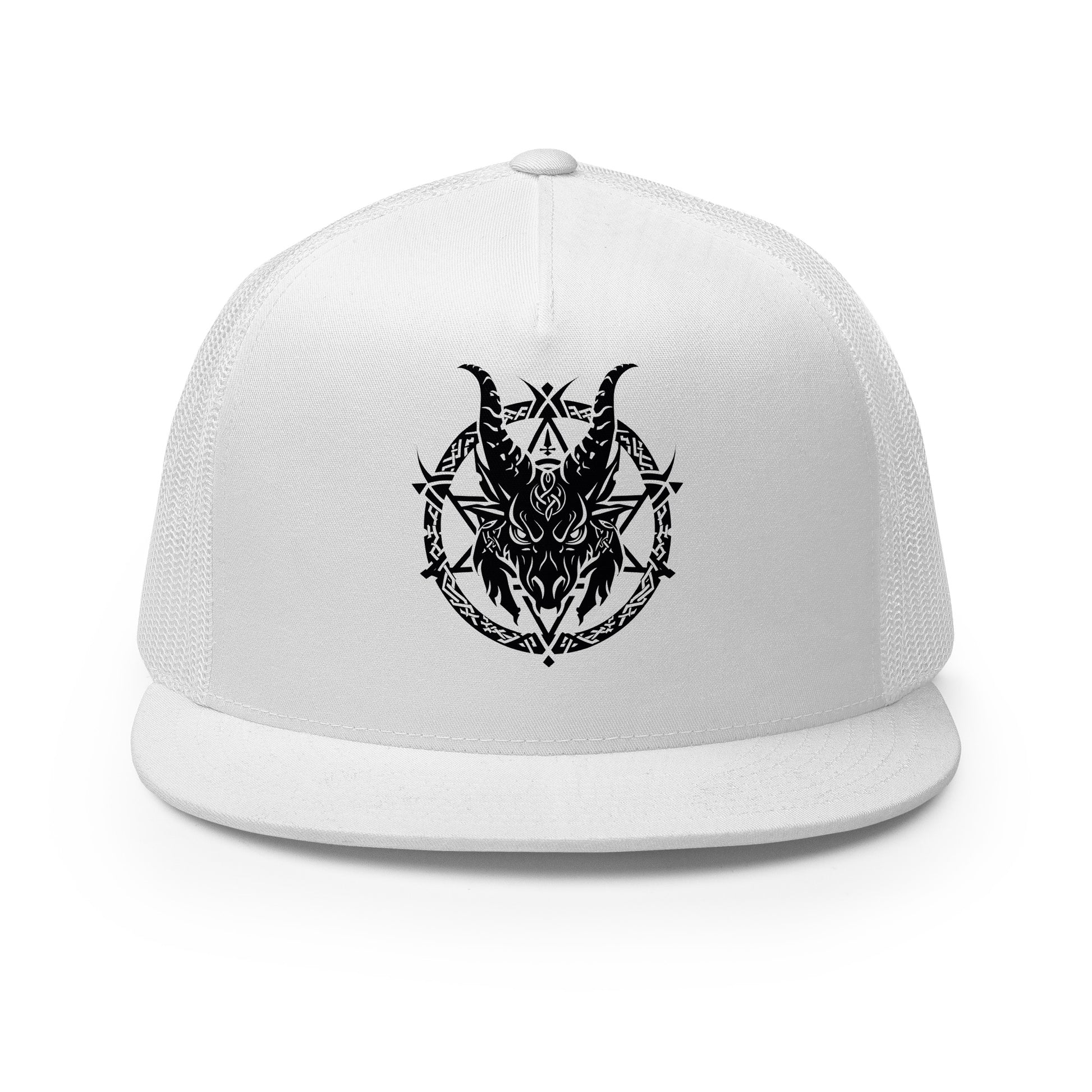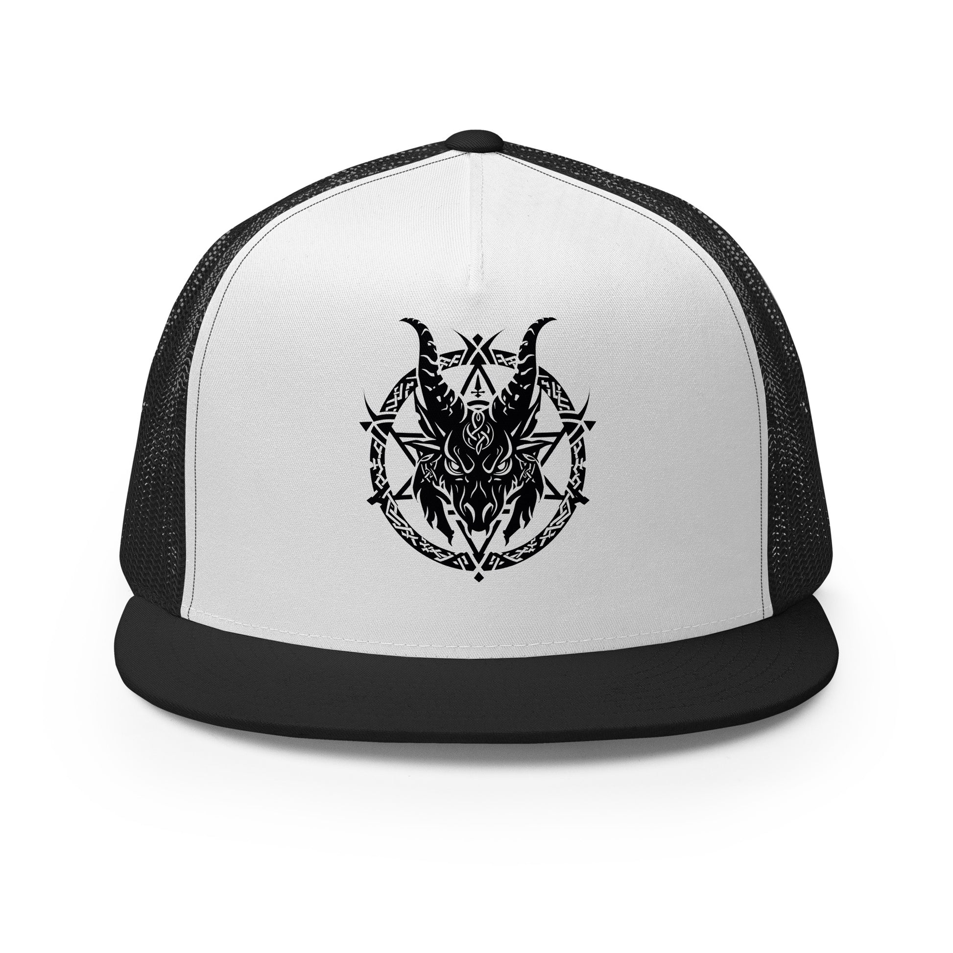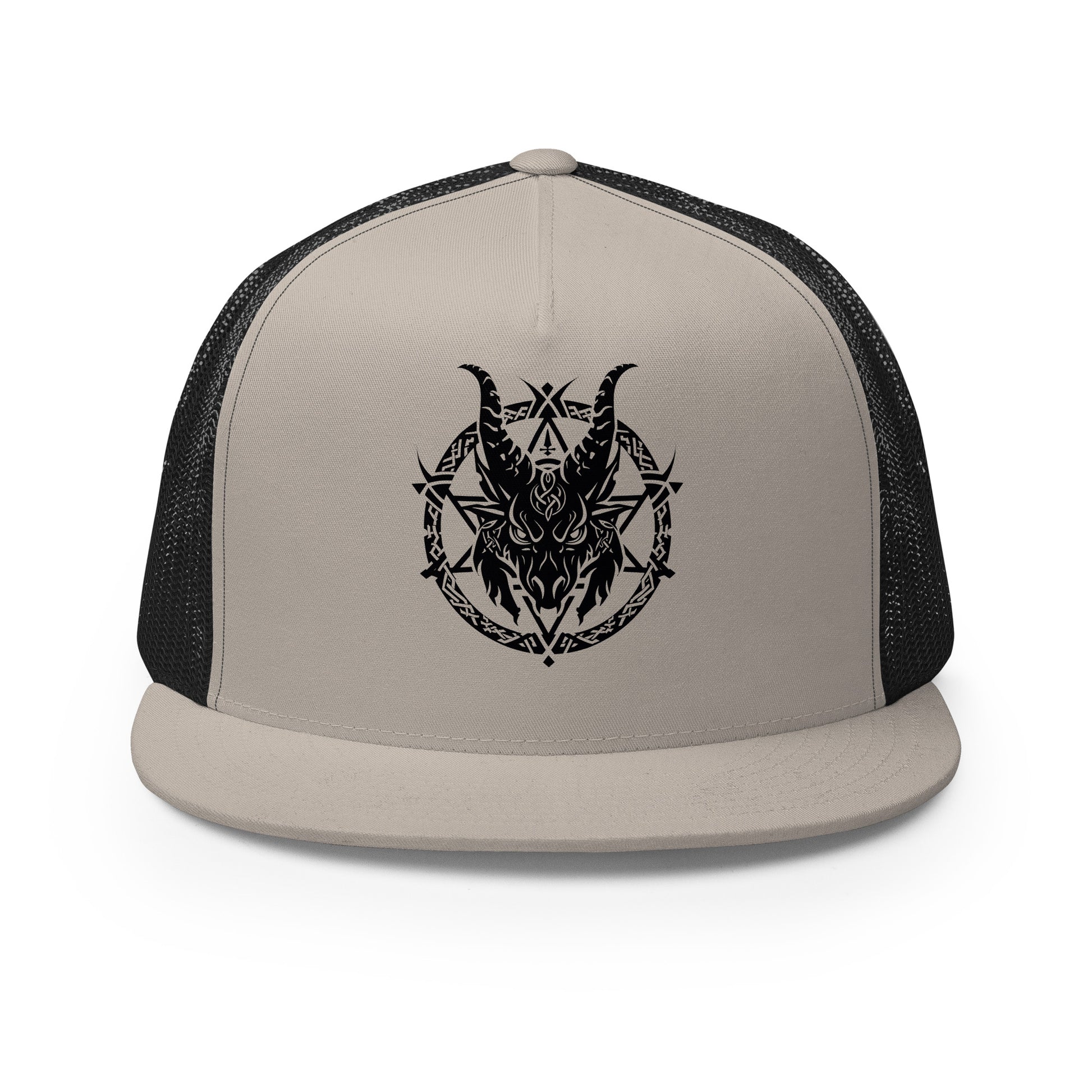 Casquette trucker au style classique incluant une impression représentant Baphomet, symbole de mystère et de puissance occulte.