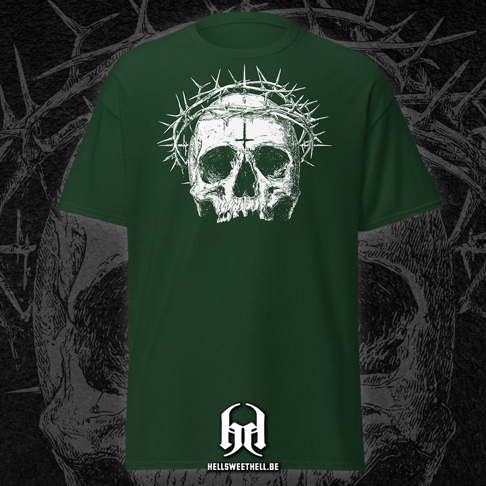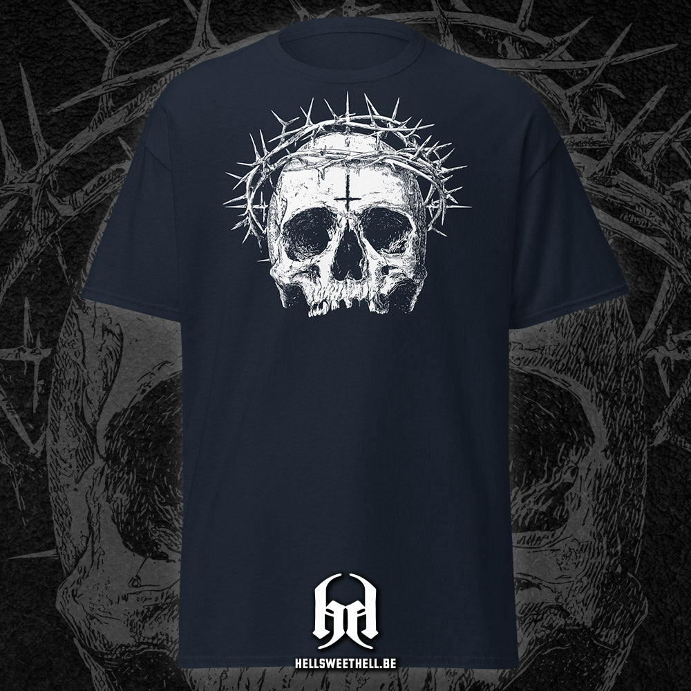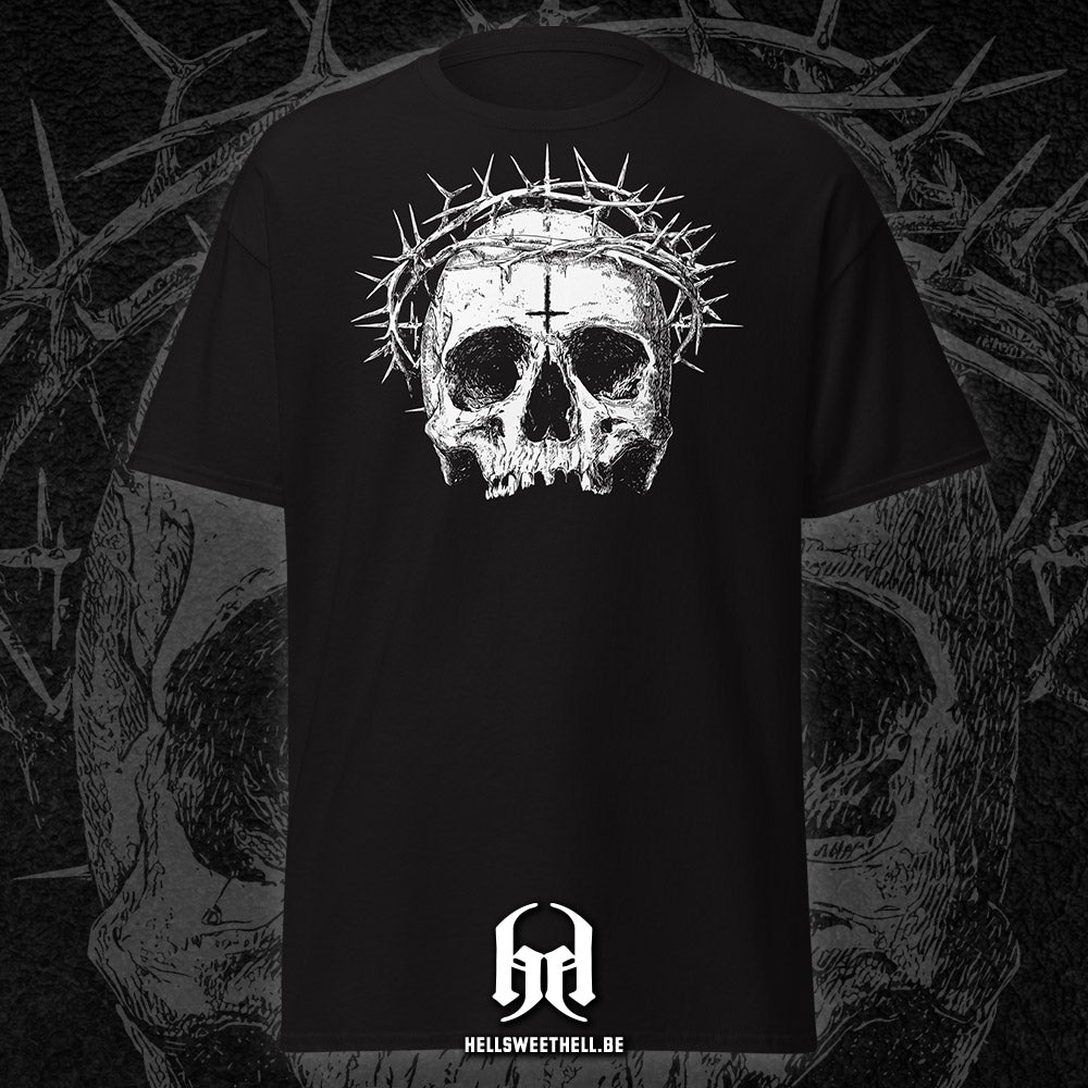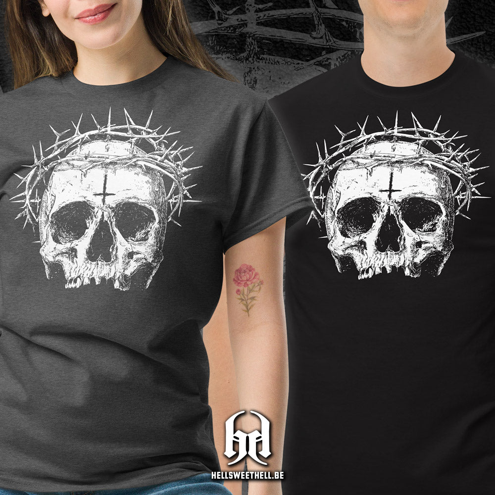 Un crâne blafard, marqué au front par une croix inversée, surmonté d’une couronne d’épines acérées : "Cursed" incarne le blasphème sacré, là où les symboles de foi se transforment en malédiction. Ce design percutant interroge, dérange, et ne laisse personne indifférent. Une pièce forte, pour celles et ceux qui aiment défier les dogmes avec style.