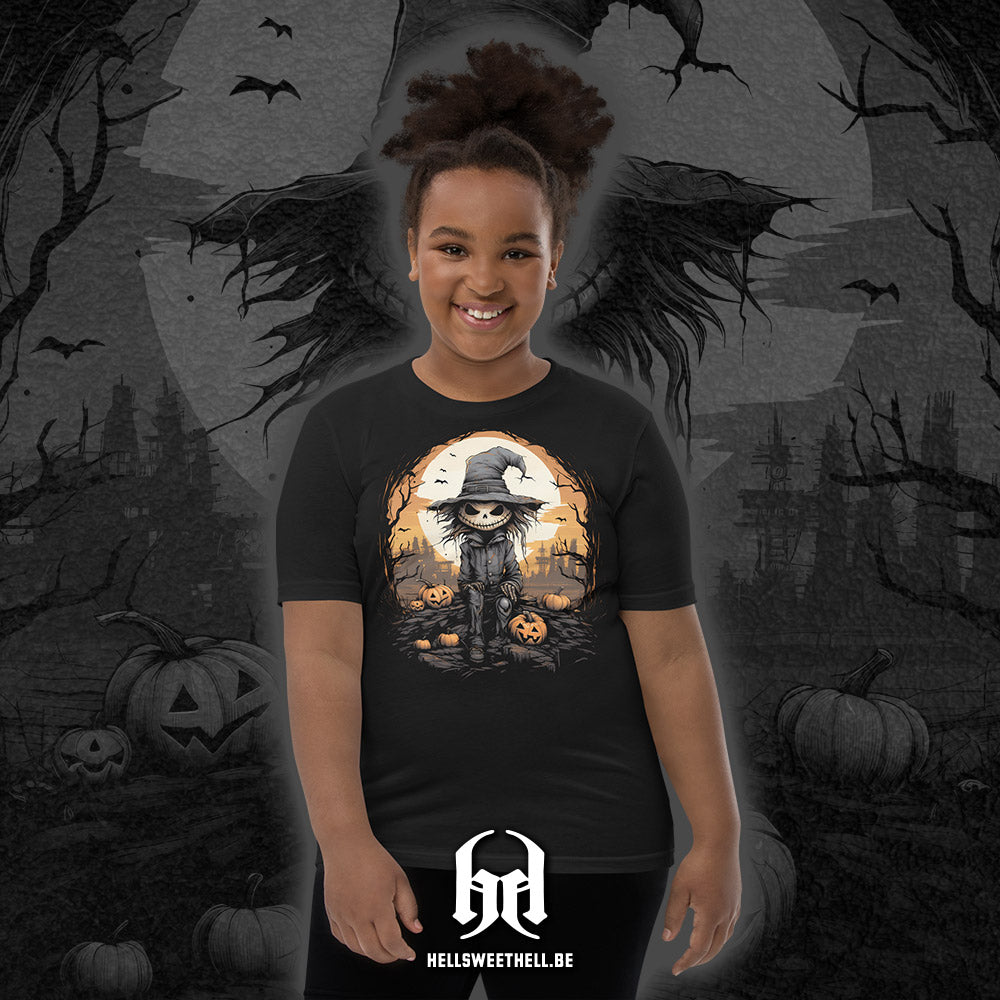 Mettez-vous dans l'esprit d'Halloween avec notre textile épouvantail, un incontournable pour les festivités d'octobre. Fabriqué en coton doux de qualité, ce t-shirt pour enfants et adolescents comporte une illustration détaillée d'un épouvantail effrayant et fun, parfait pour compléter votre tenue d'Halloween.