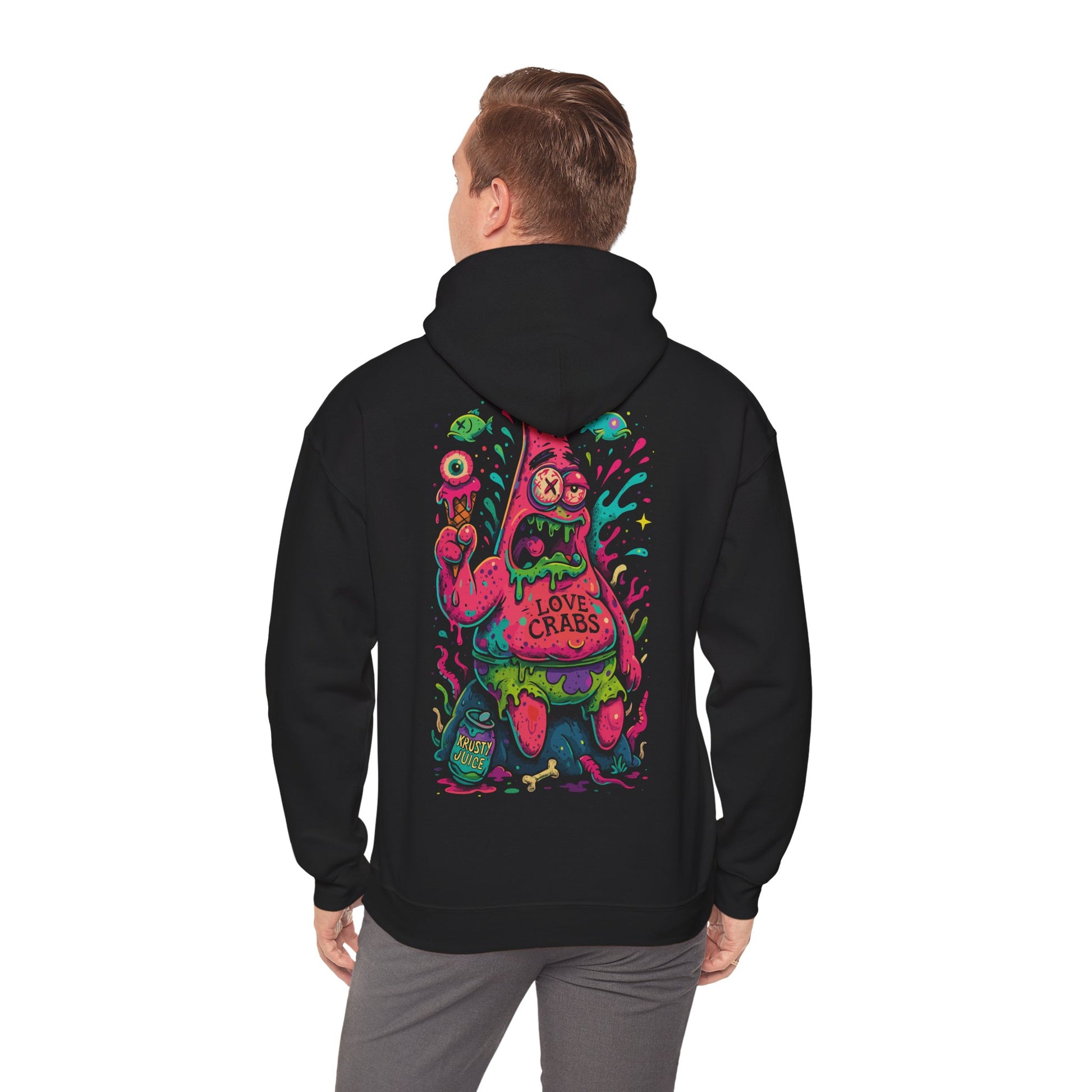 Plonge dans l’abîme avec L’Étoile déchue, version toxico-trash d’un habitant sous-marin bien connu. Boursouflé de couleurs radioactives, vomi mutant, canette douteuse et regard halluciné : ce pull à capuche est un cri visuel venu des profondeurs les plus sombres de l’océan. Parfait pour celles et ceux qui aiment le streetwear dégénéré et les références pop détournées façon art urbain.