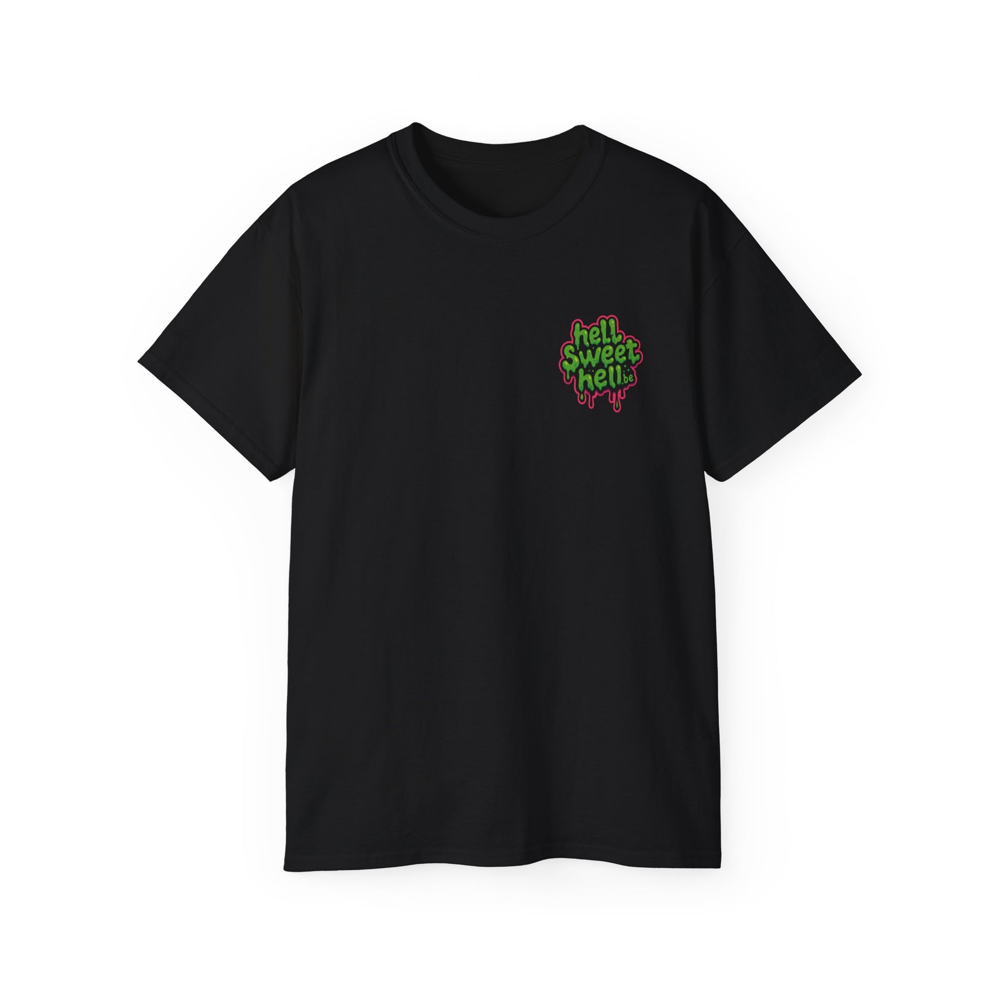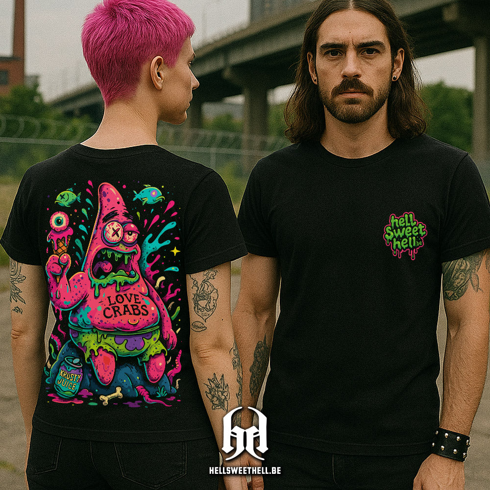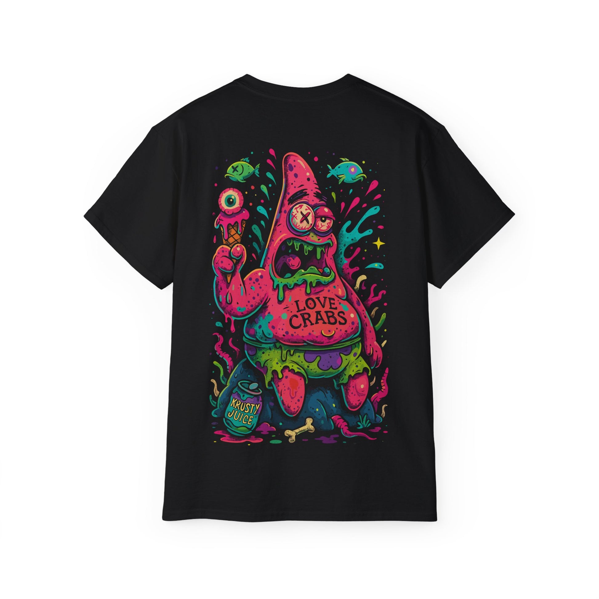 Plonge dans l’abîme avec L’Étoile déchue, version toxico-trash d’un habitant sous-marin bien connu. Boursouflé de couleurs radioactives, vomi mutant, canette douteuse et regard halluciné : ce t-shirt est un cri visuel venu des profondeurs les plus sombres de l’océan. Parfait pour celles et ceux qui aiment le streetwear dégénéré et les références pop détournées façon art urbain.