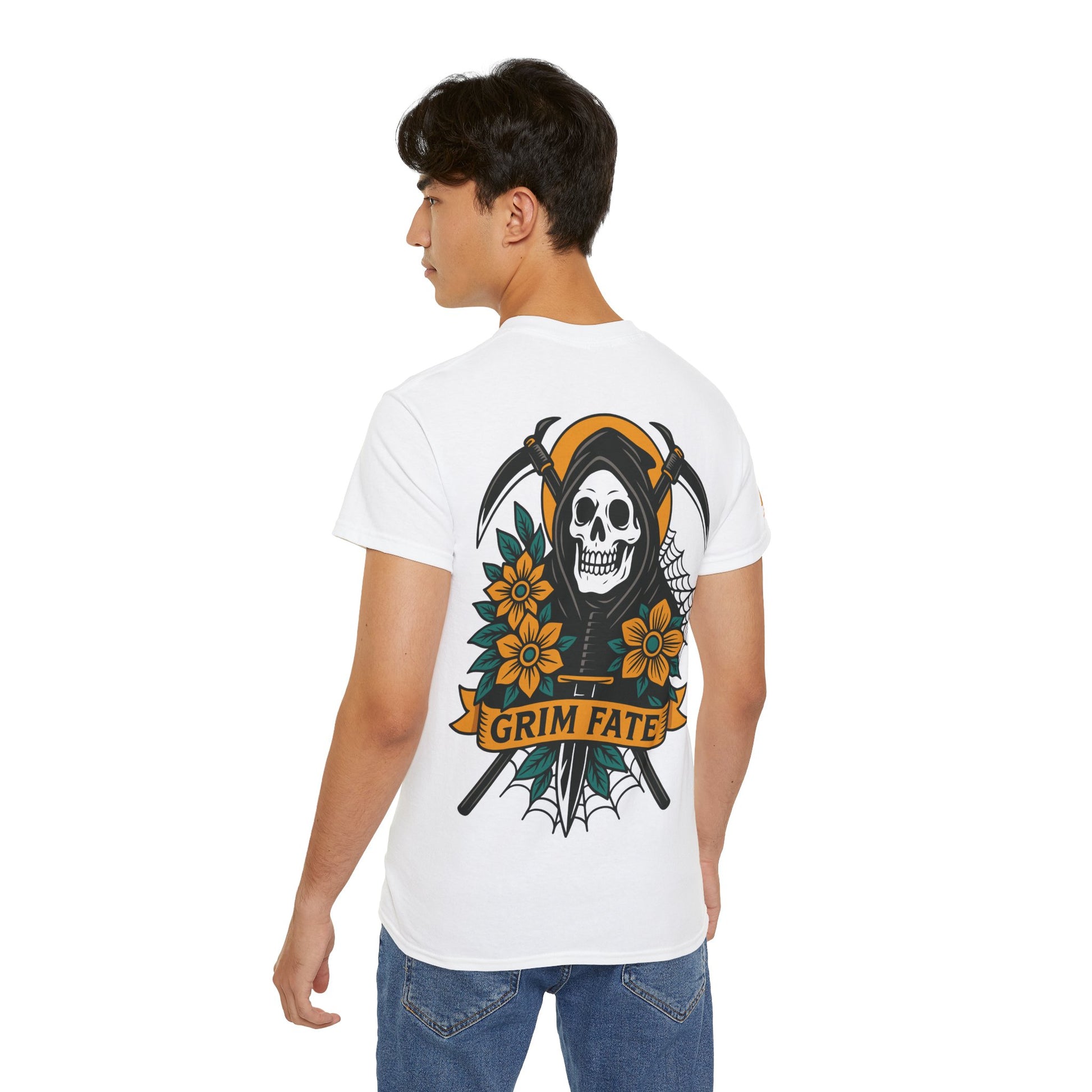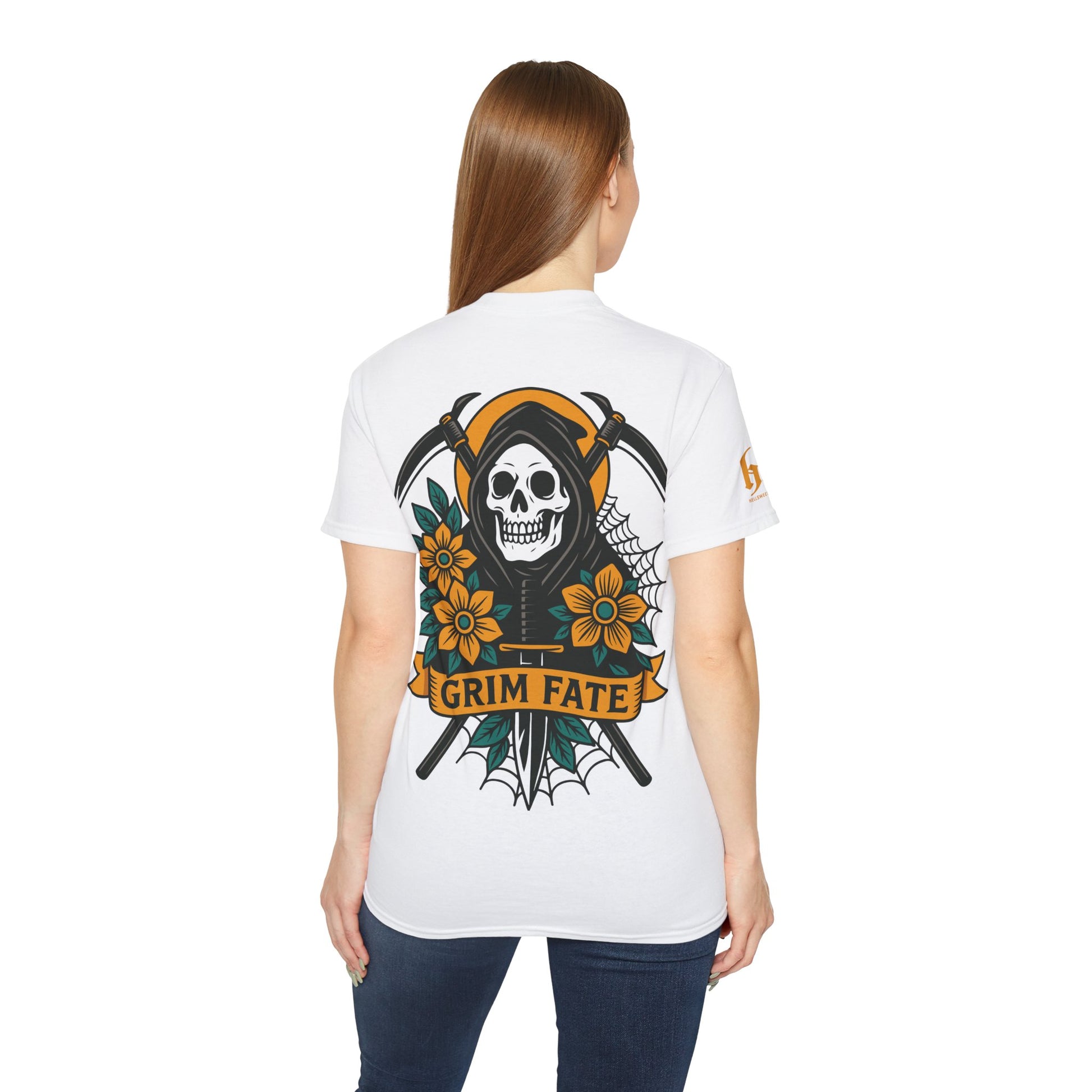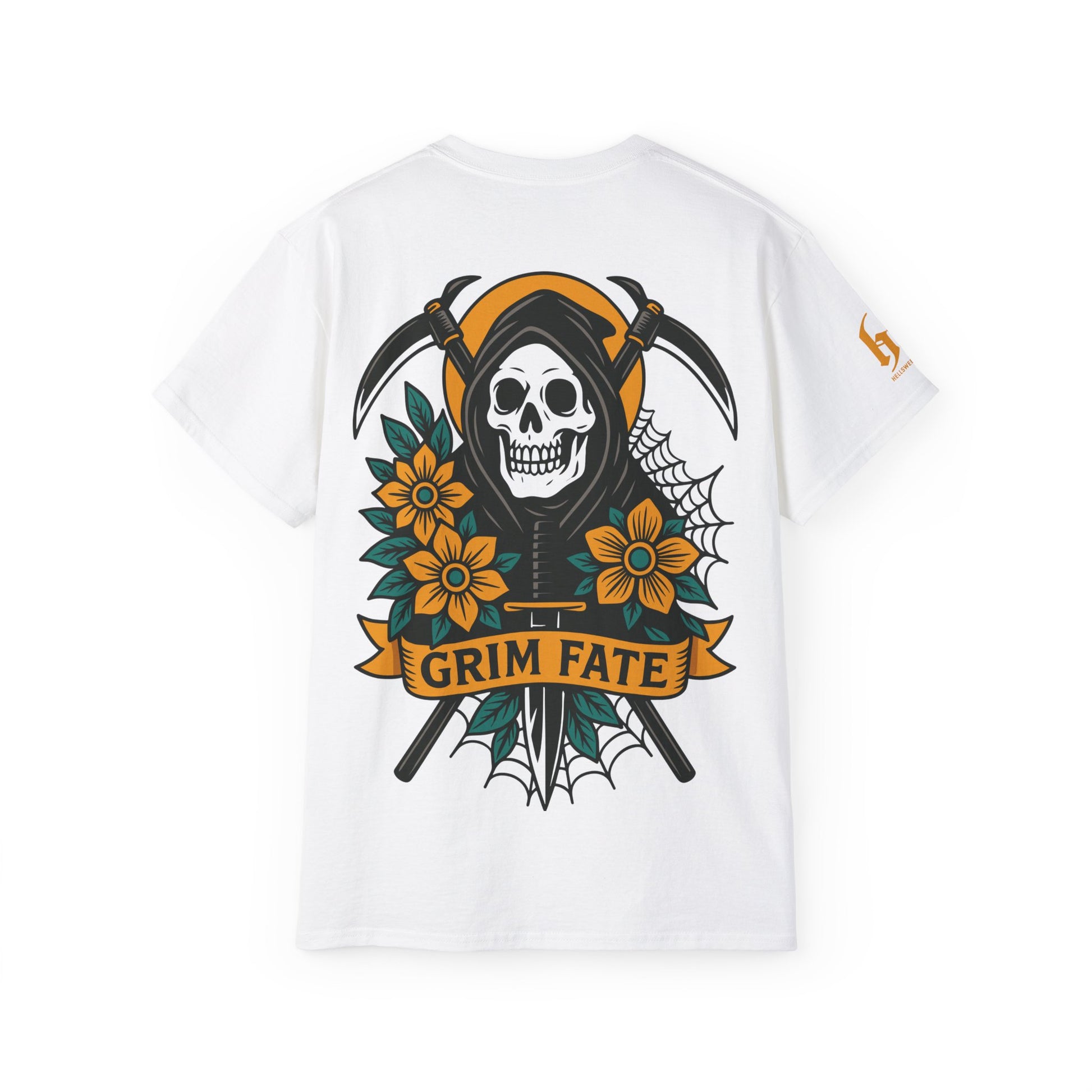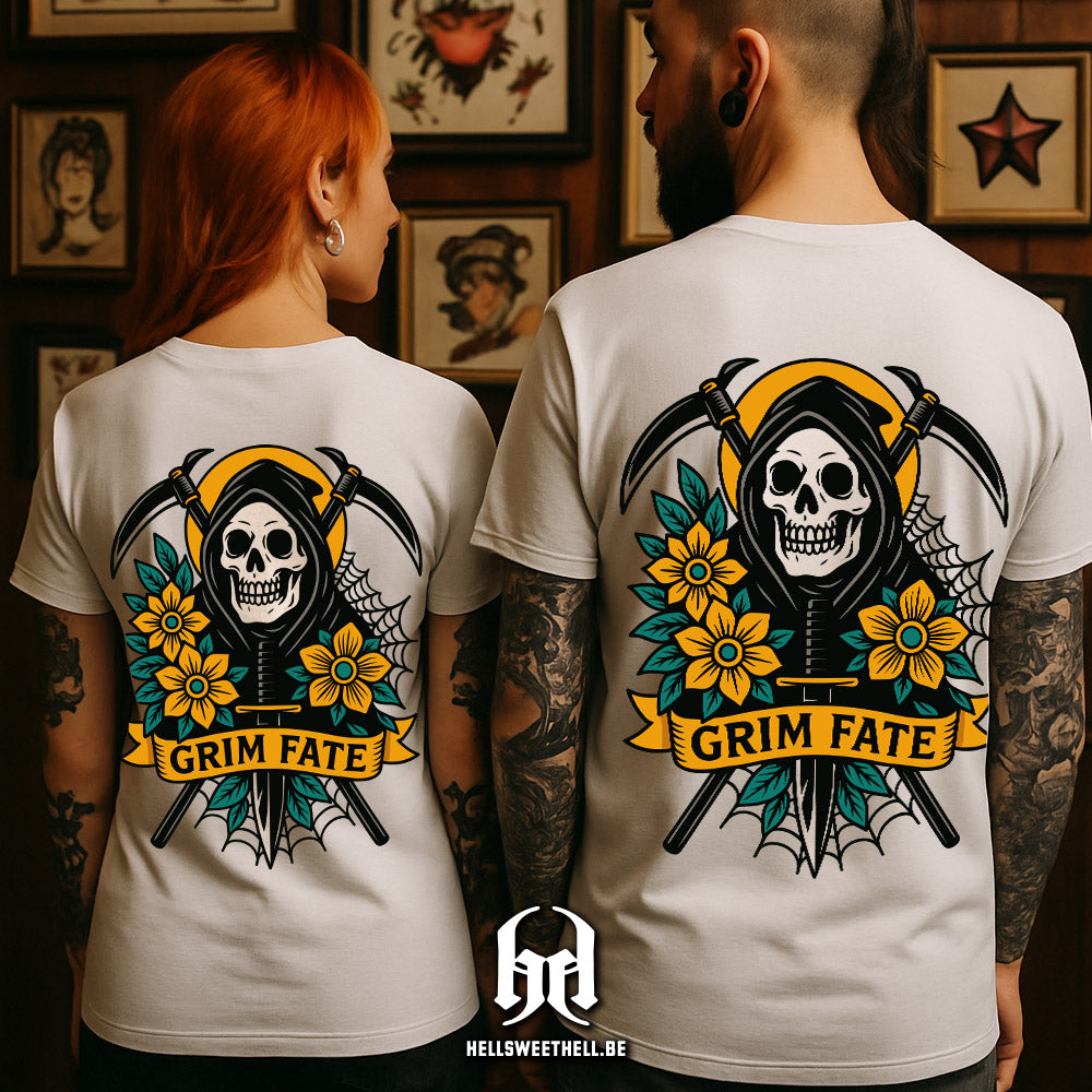 Faucheuse, fleurs et toiles d’araignée — la beauté et la mort entremêlées. Un clin d’œil au tattoo old school, pour ceux qui portent leur destinée sombre avec style.