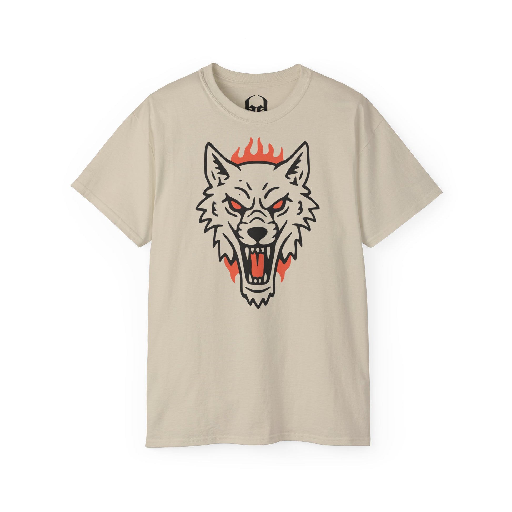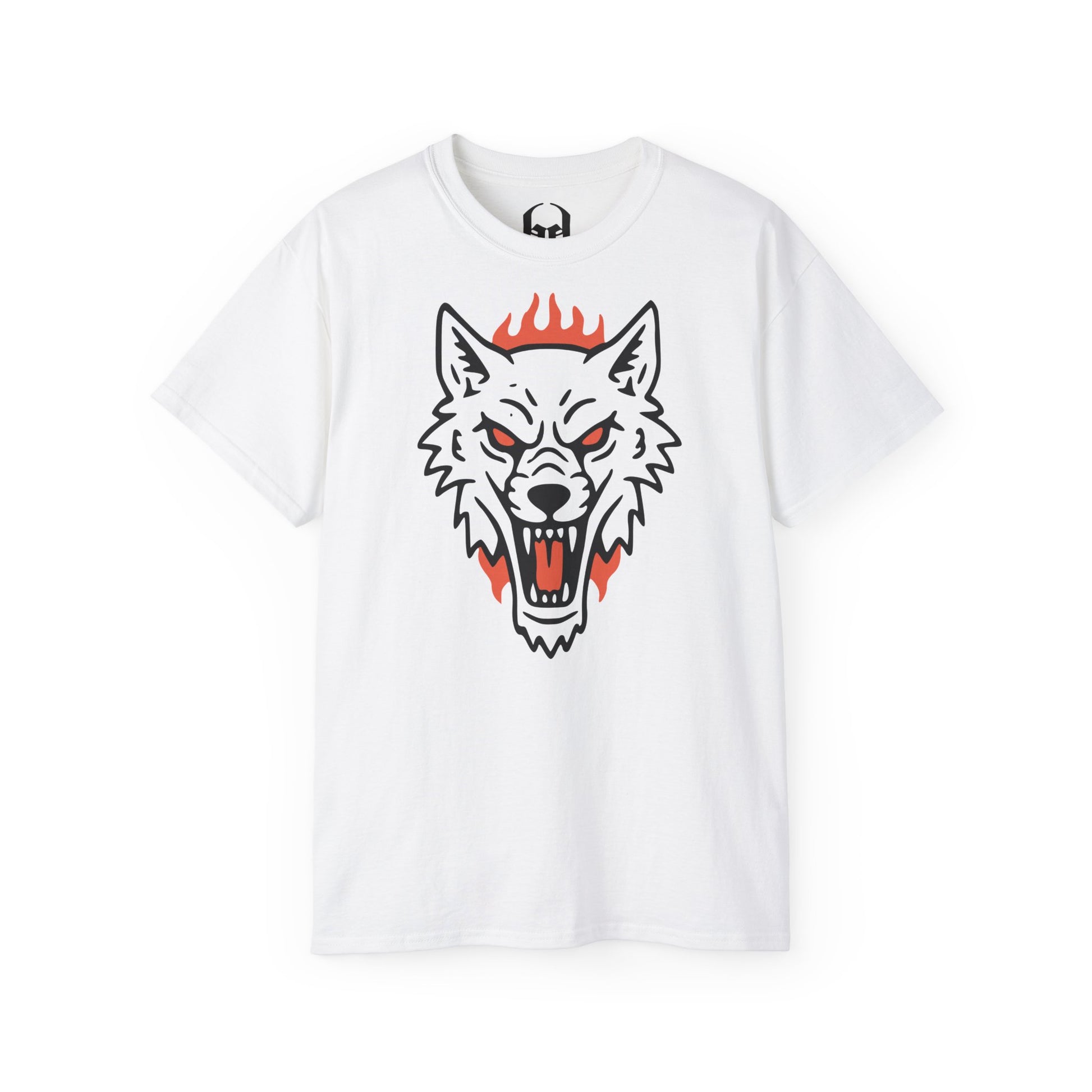 Affichez votre côté sauvage avec ce design percutant au style néo-traditionnel. Ce visuel représente une tête de loup hurlant, gueule grande ouverte, soulignée par des flammes ardentes qui accentuent son intensité. Les lignes noires épaisses et le contraste avec l'orangé vif offrent un rendu graphique puissant, idéal pour ceux qui ne veulent pas passer inaperçus.