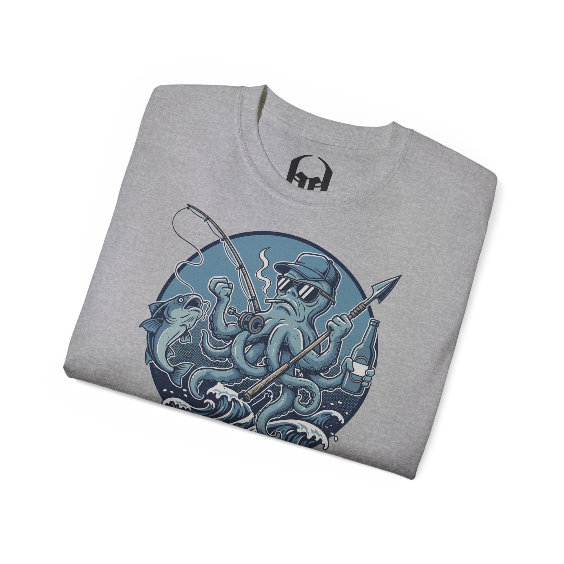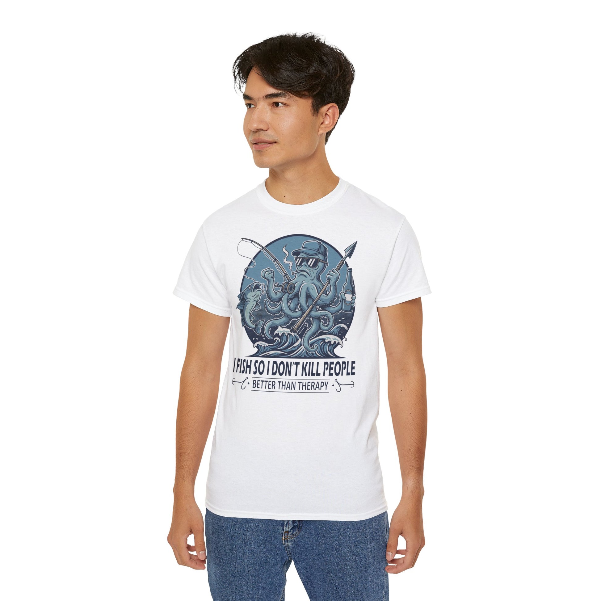 Ce visuel délirant joue la carte de l’humour noir et de la thérapie sauvage : un t-shirt parfait pour ceux qui préfèrent sortir leur hameçon plutôt que leurs nerfs. Idéal pour les fans de pêche, de second degré et de looks décalés.
