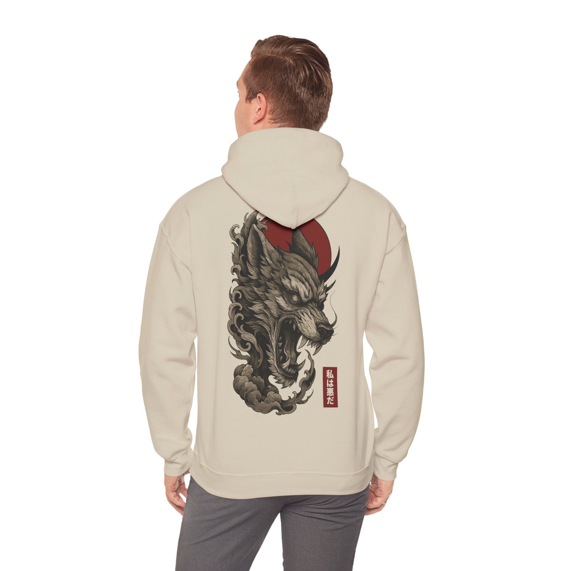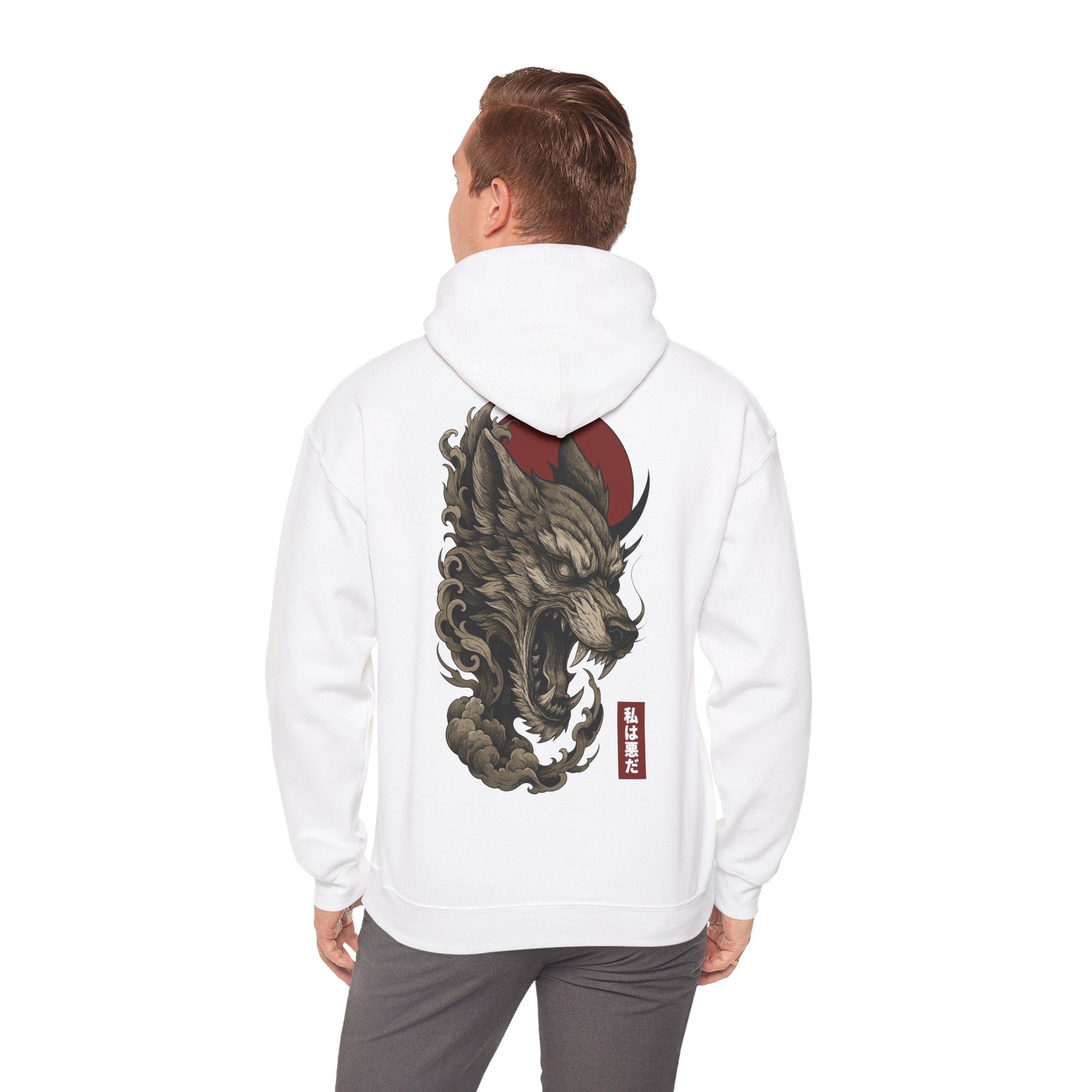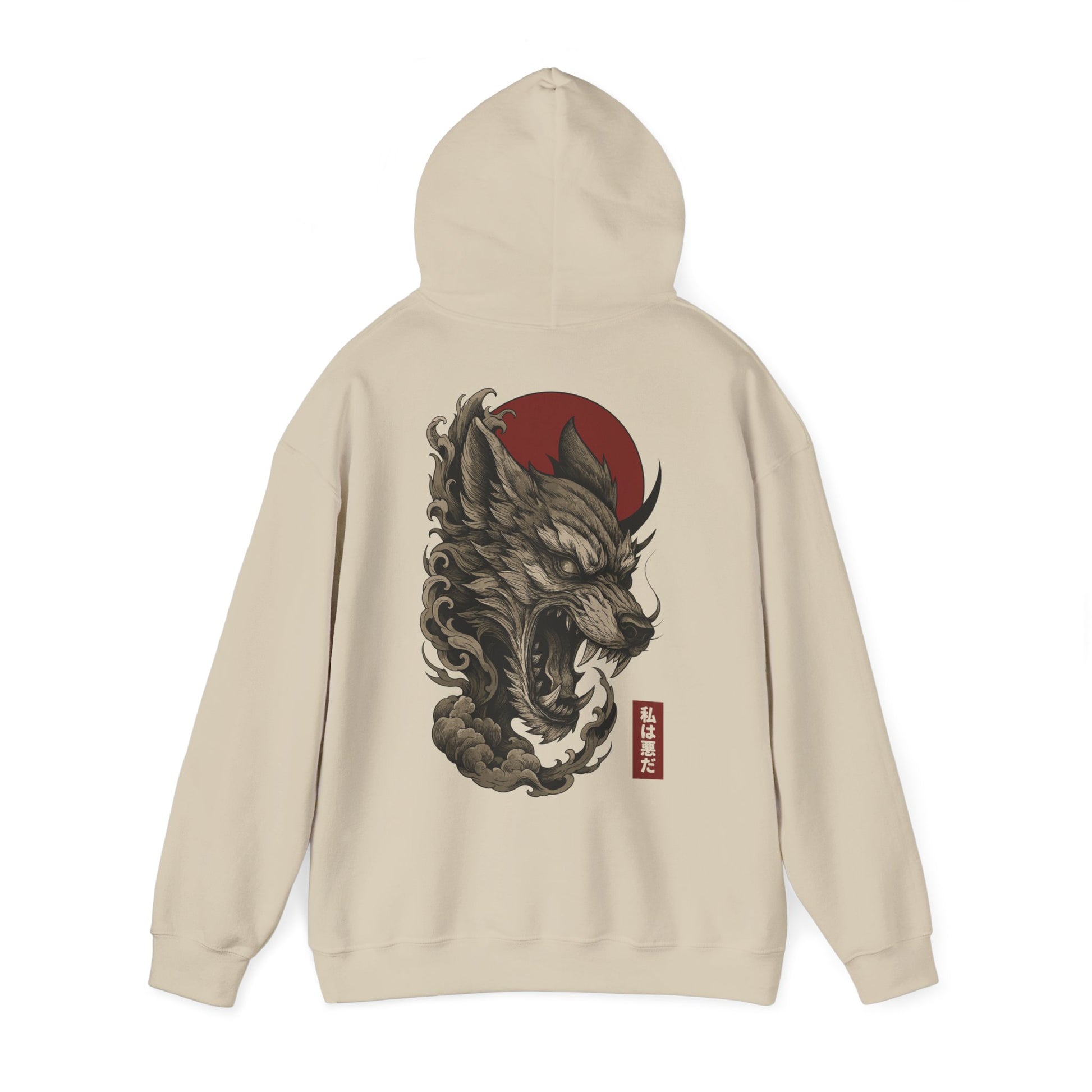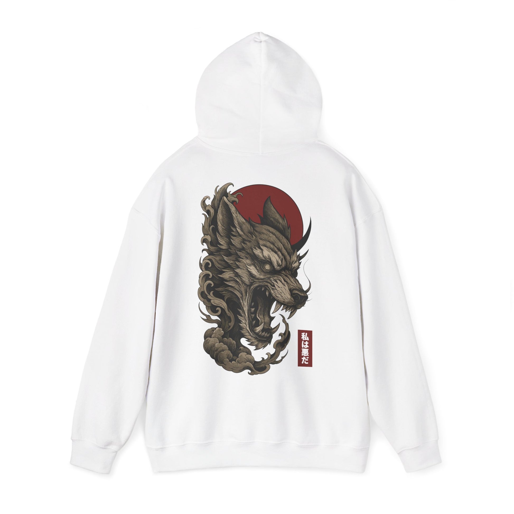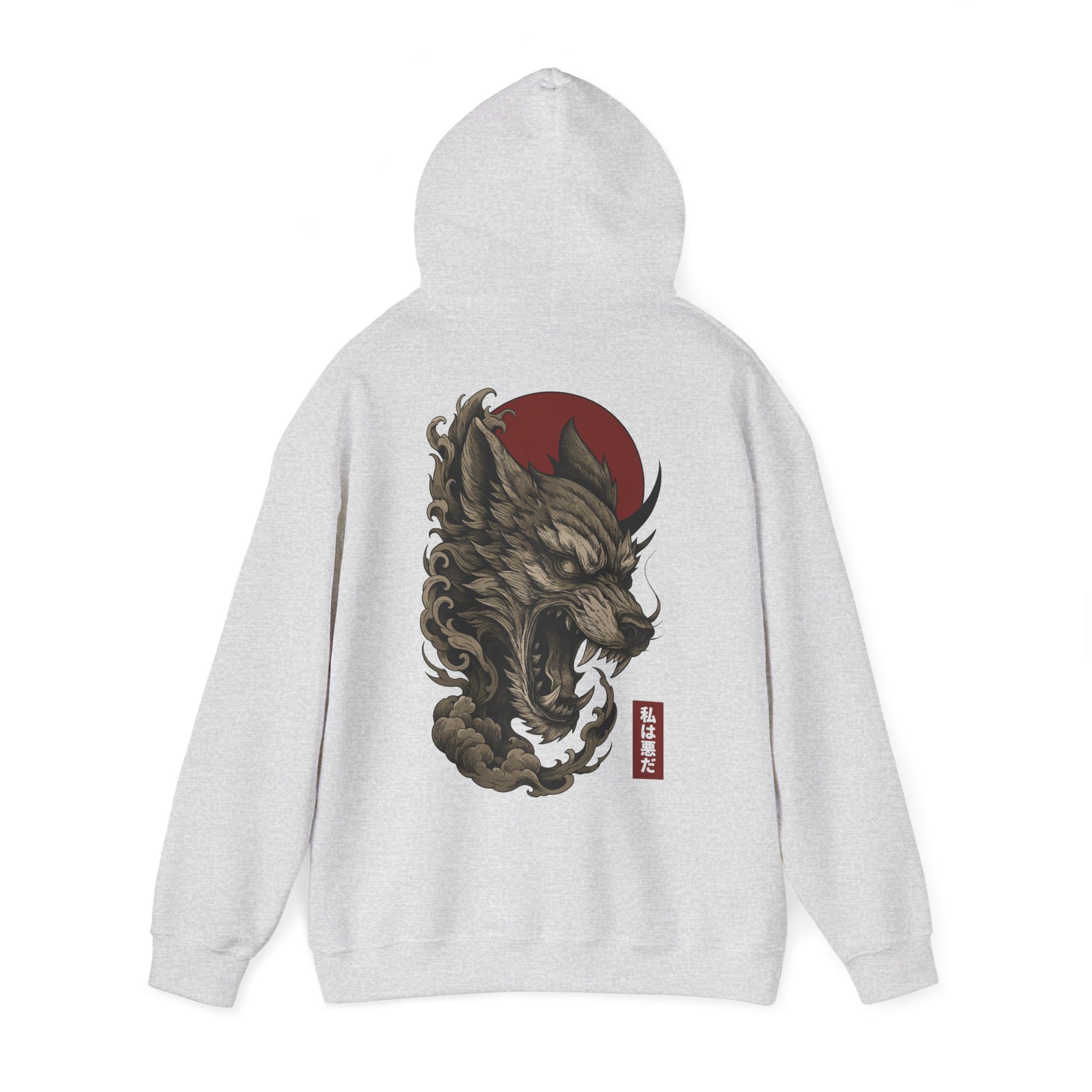 Un loup démoniaque prêt à mordre, encerclé de nuages sombres sous un soleil rouge sang. Un visuel inspiré du tattoo japonais et des yokai pour un pull à capuche qui claque, sans compromis. Typographie japonaise : 私は悪だ — « Je suis le mal ».