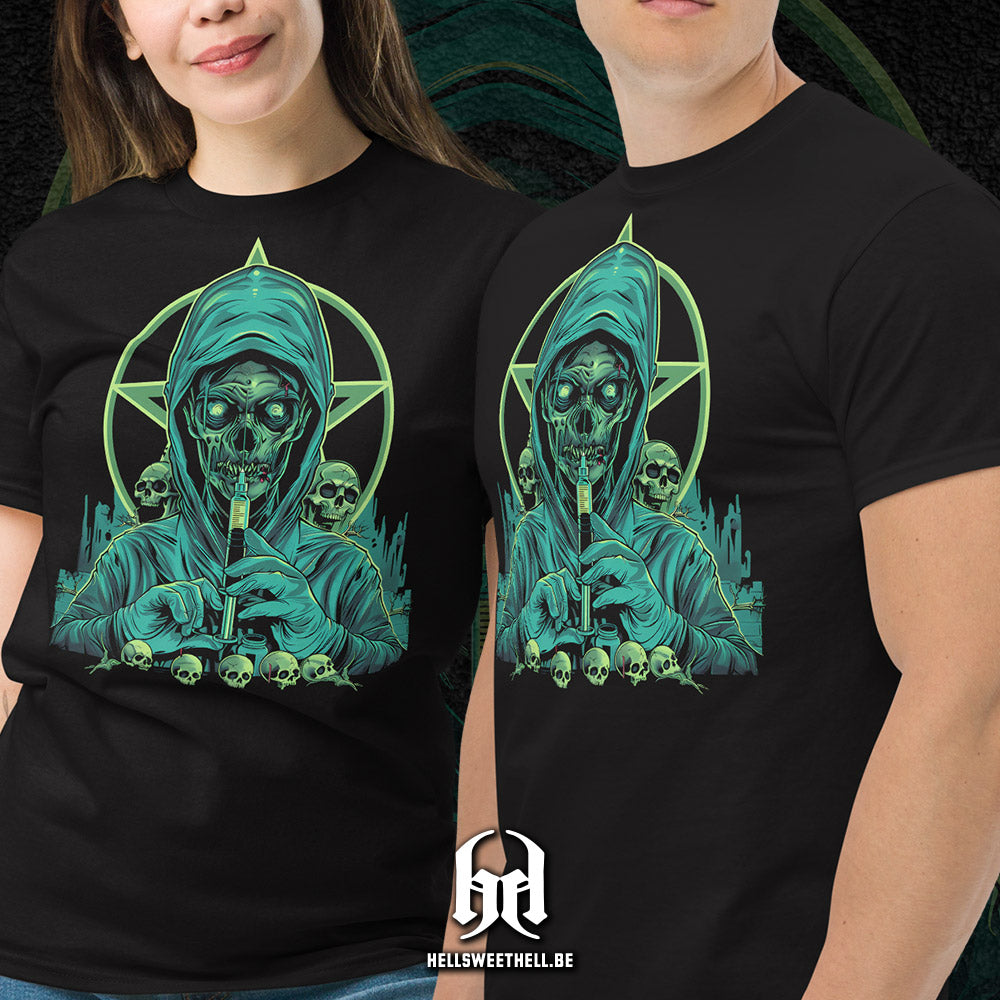 Ce médecin revenu d’entre les morts tient une seringue remplie d’un liquide inconnu… Poison ou remède ? Ce design audacieux, aux couleurs éclatantes, mélange l’horreur et l’ironie dans un style unique. Un incontournable pour ceux qui aiment les créations sombres et provocantes.