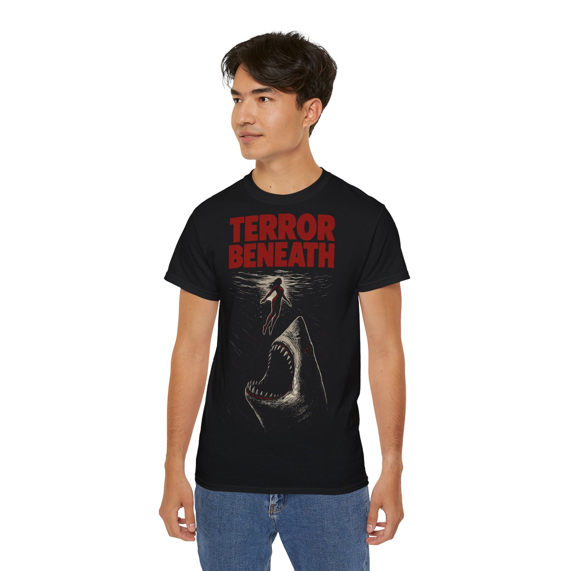 Plongée nocturne. Une silhouette solitaire fend les eaux noires, insouciante, libre... mais sous la surface, quelque chose approche. Une ombre, une menace, un instinct ancien prêt à frapper. Ce design rend hommage à l’une des scènes les plus glaçantes du cinéma : la vulnérabilité humaine face à la nature sauvage et implacable.