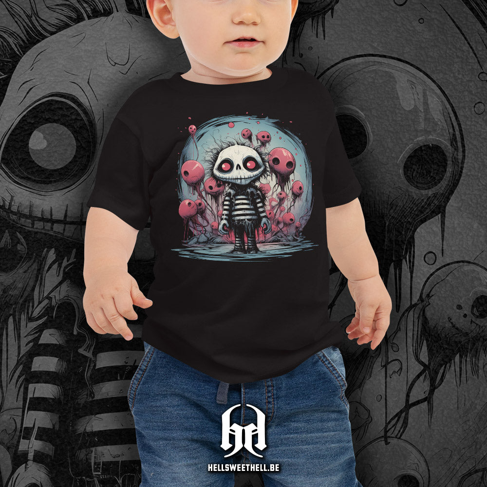 Plongez dans le monde singulier avec notre textile au design captivant. Ce t-shirt unique ajoute une touche sombre et artistique au style de votre enfant