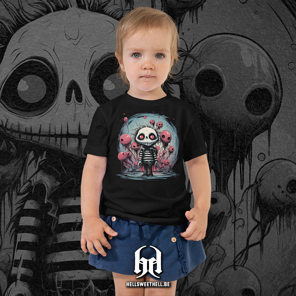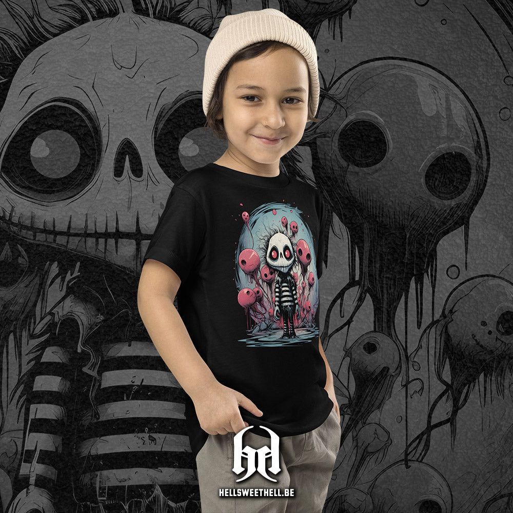 Plongez dans le monde singulier avec notre textile au design captivant. Ce t-shirt unique ajoute une touche sombre et artistique au style de votre enfant