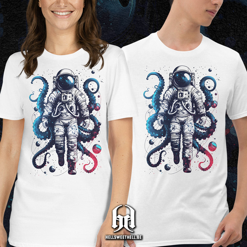 Un astronaute solitaire flotte dans l’espace infini, mais il n’est pas seul… De sombres tentacules s’étendent vers lui, distordant la réalité dans un ballet inquiétant entre l’homme et l’inconnu. Un design saisissant qui évoque les profondeurs abyssales de l’univers.
