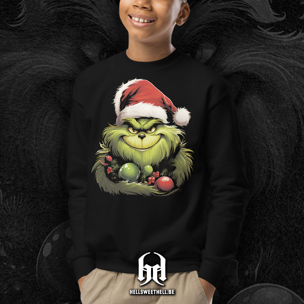 Affirmez votre style avec notre sweat unisexe pour enfants et adolescents représentant le personnage emblématique du Grinch !