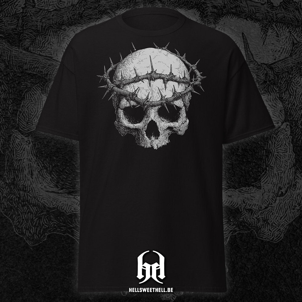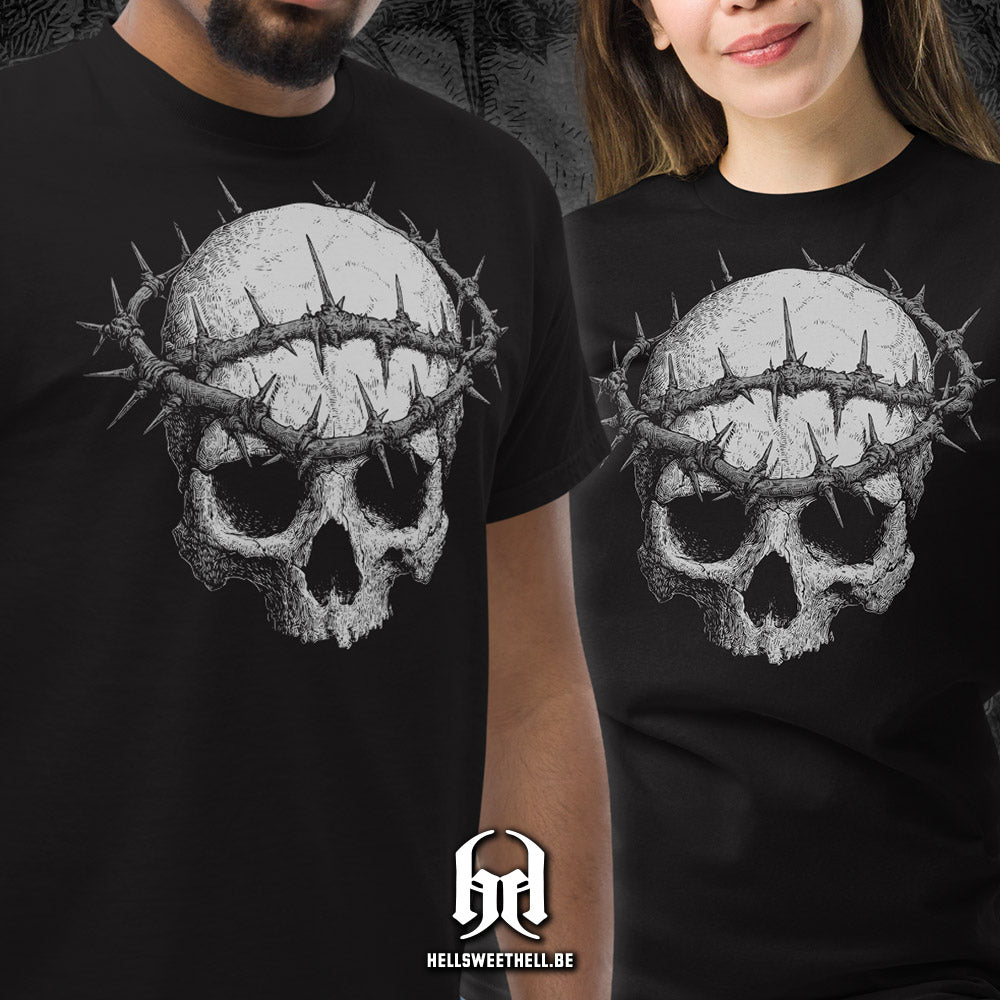 Ce design percutant oppose la majesté d'une couronne à la brutalité de l’os. Le crâne, symbole de finitude, porte les traces d’un sacrifice silencieux. Un visuel intense, à la croisée du sacré et du profane, parfait pour un look chargé de symboles et de contrastes.