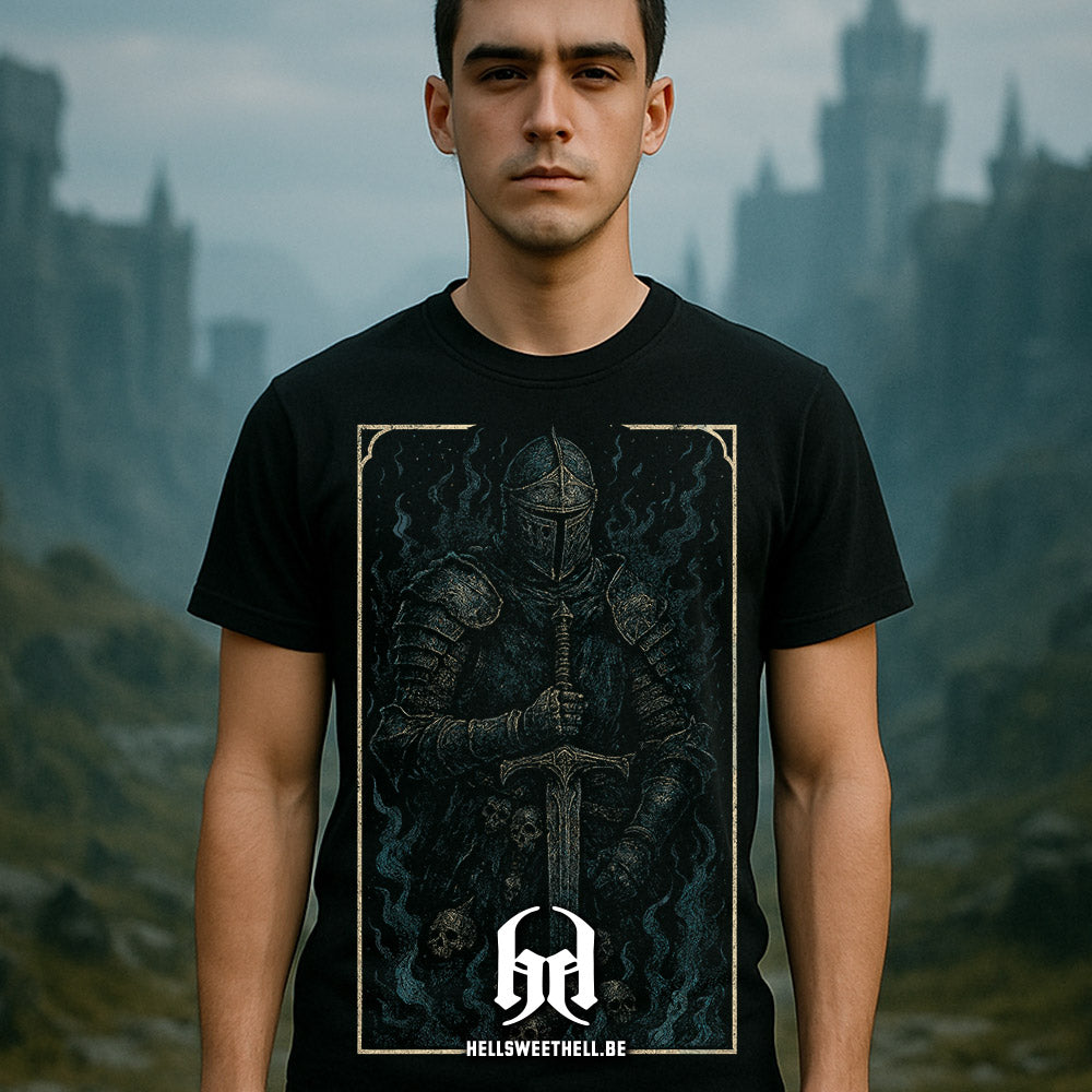 Un chevalier sombre émerge des flammes bleutées, l’épée plantée parmi les crânes, prêt à affronter les ténèbres. Un design détaillé, brutal et mystique pour tous ceux qui vivent pour la dark fantasy et les mondes impitoyables façon soulslike.