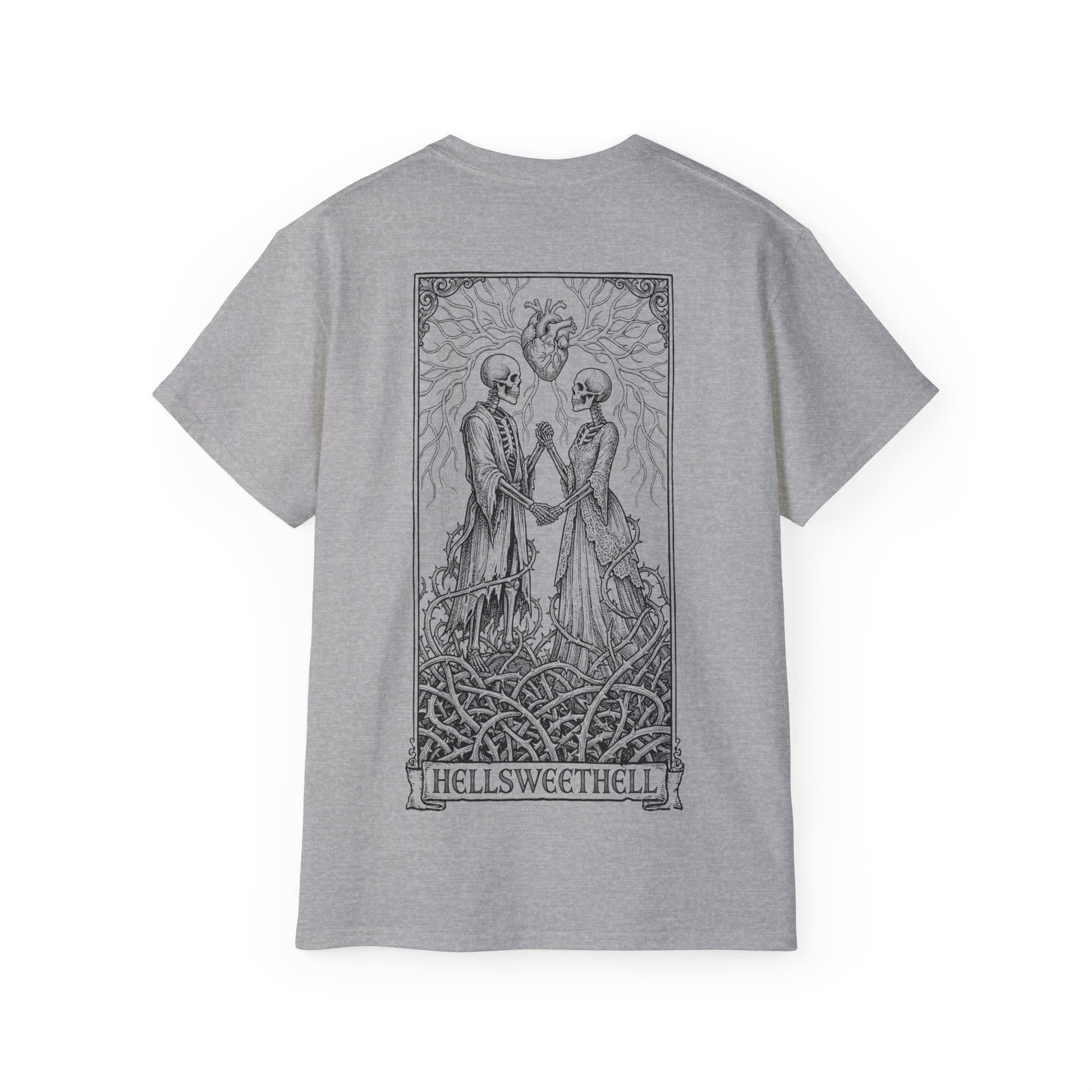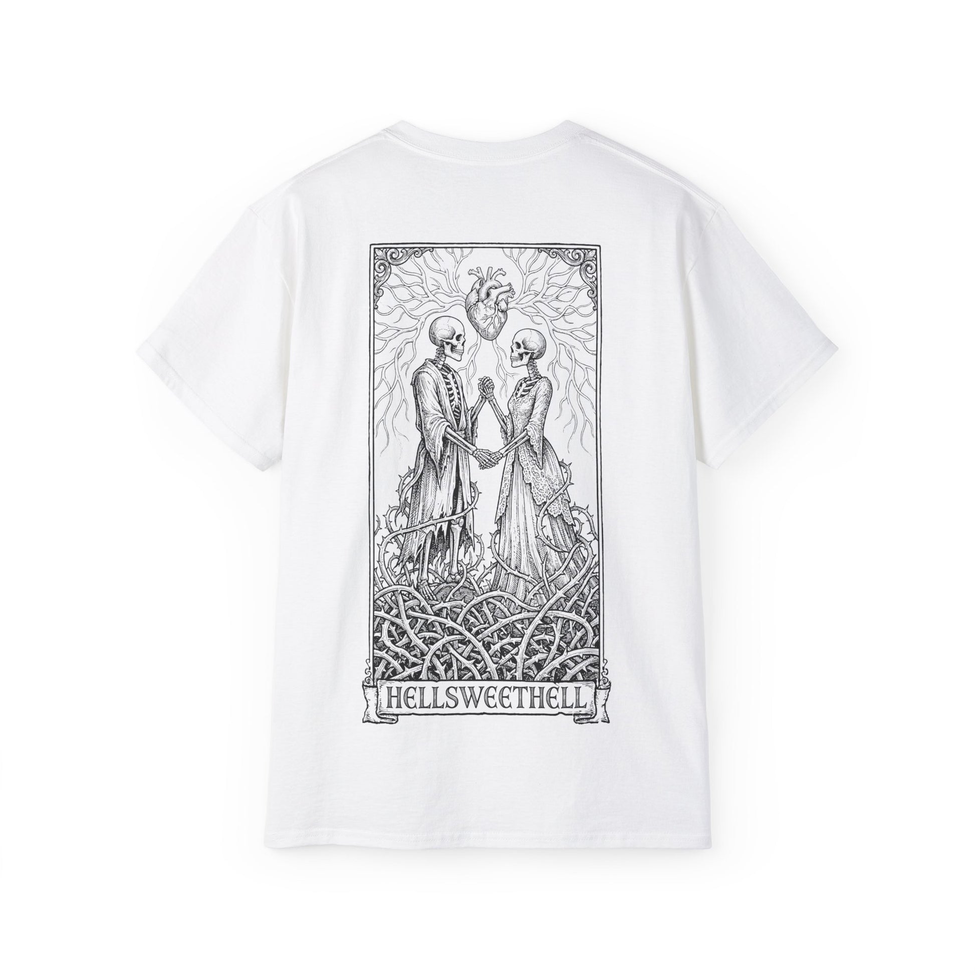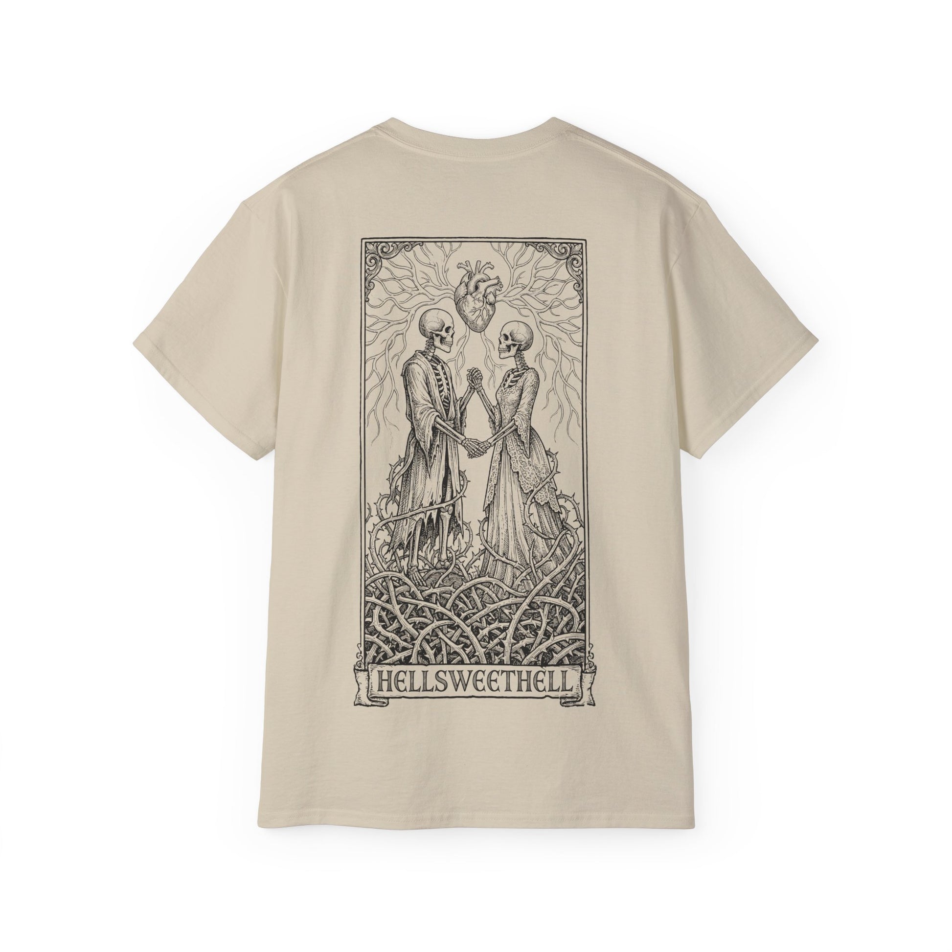 Un hommage à l'amour qui défie le temps et la chair. Ce design s'inspire de l'imagerie médiévale des "Amants de la Mort", où l'affection est représentée avec la rudesse et la vérité des gravures sur bois du XVe siècle. Le trait est brut, les hachures sont profondes, évoquant une œuvre gravée à même la pierre ou le bois.