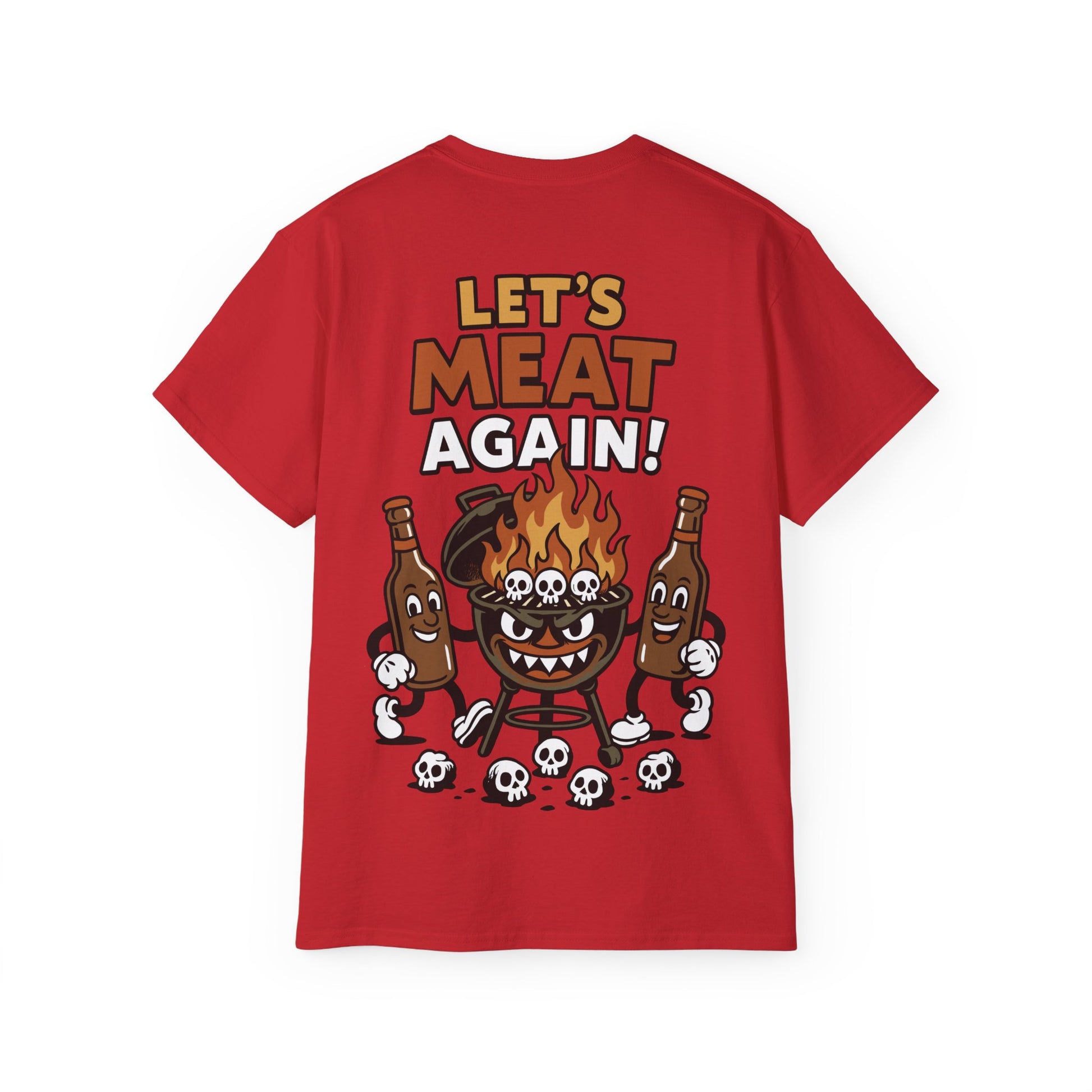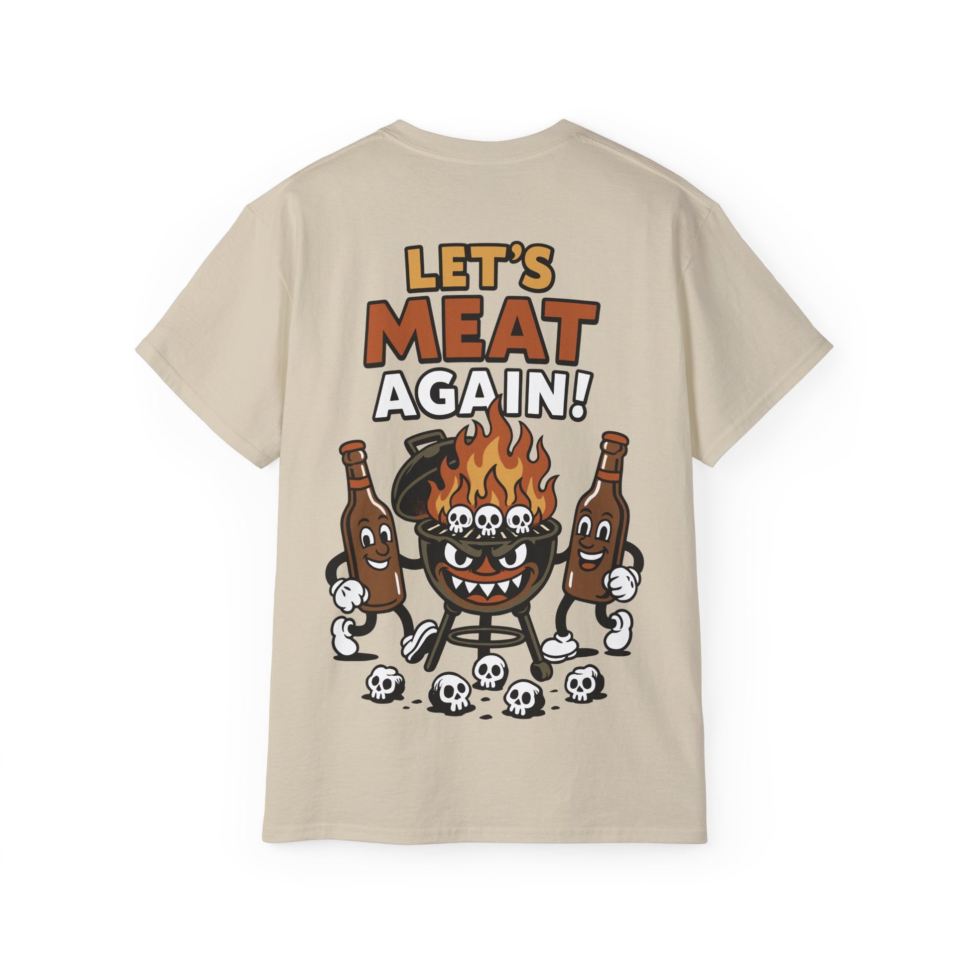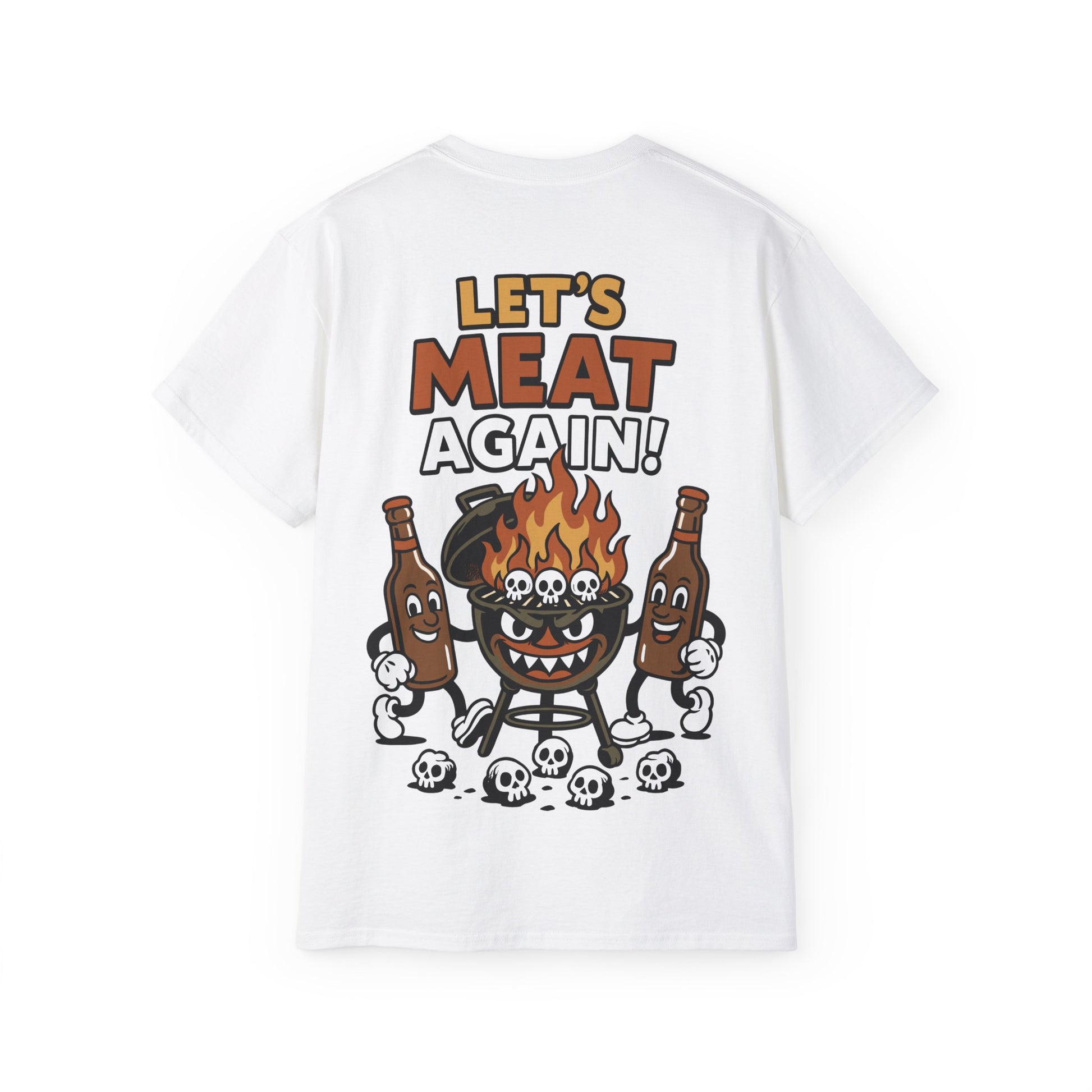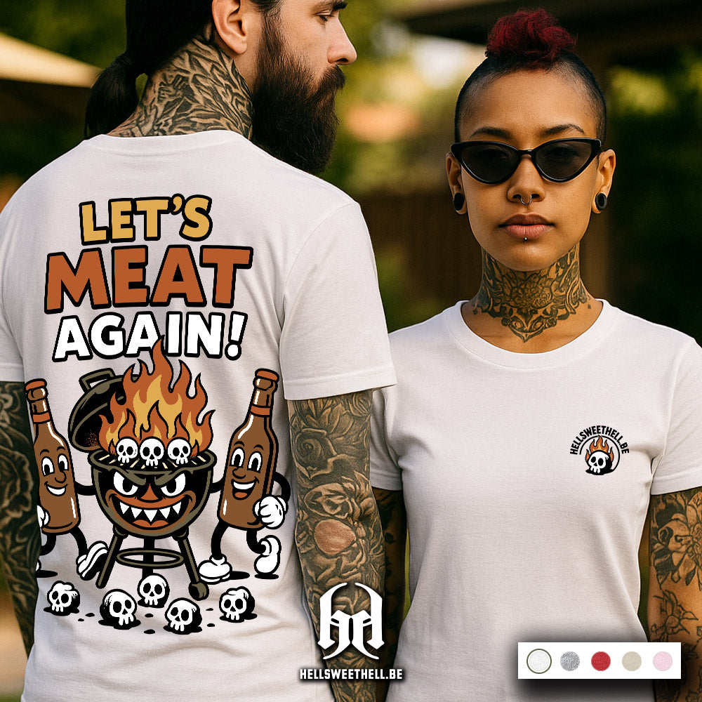 Ambiance BBQ dark et humour noir : un barbecue démoniaque, des bières possédées, et des crânes qui grillent joyeusement. Parfait pour ceux qui aiment les grillades avec une touche d’esprit tordu. Un visuel cartoon vintage, imprimé sur coton premium, coupe unisexe.