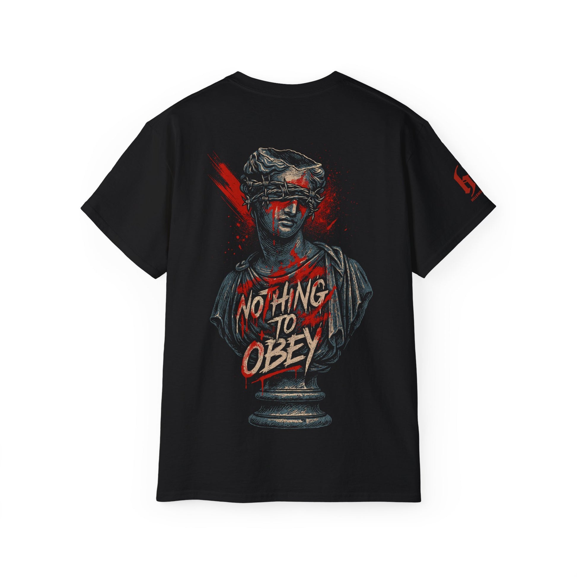 Une statue classique, barbelés sur les yeux, éclaboussée de rouge sang. Un message clair : aucune autorité à vénérer, aucun dieu à suivre.