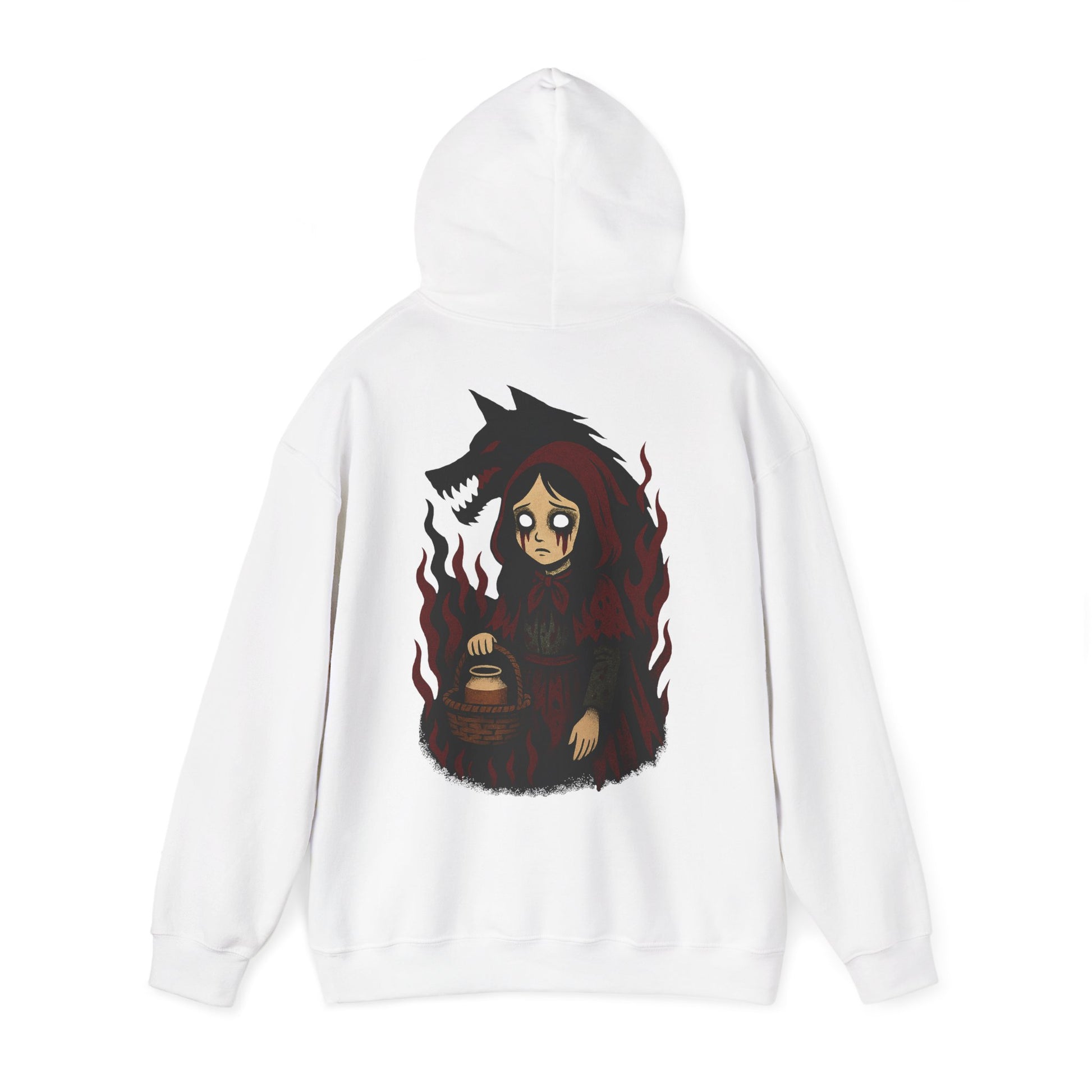 Le Petit Chaperon Rouge, version cauchemar. Les flammes dansent, les larmes coulent, et l’ombre du loup ne quitte jamais ses pas. Ce design mêle innocence perdue, fatalité silencieuse et folklore détourné avec une esthétique gothique saisissante. Un hommage sombre aux contes qui finissent mal… ou qui n’auraient jamais dû commencer.