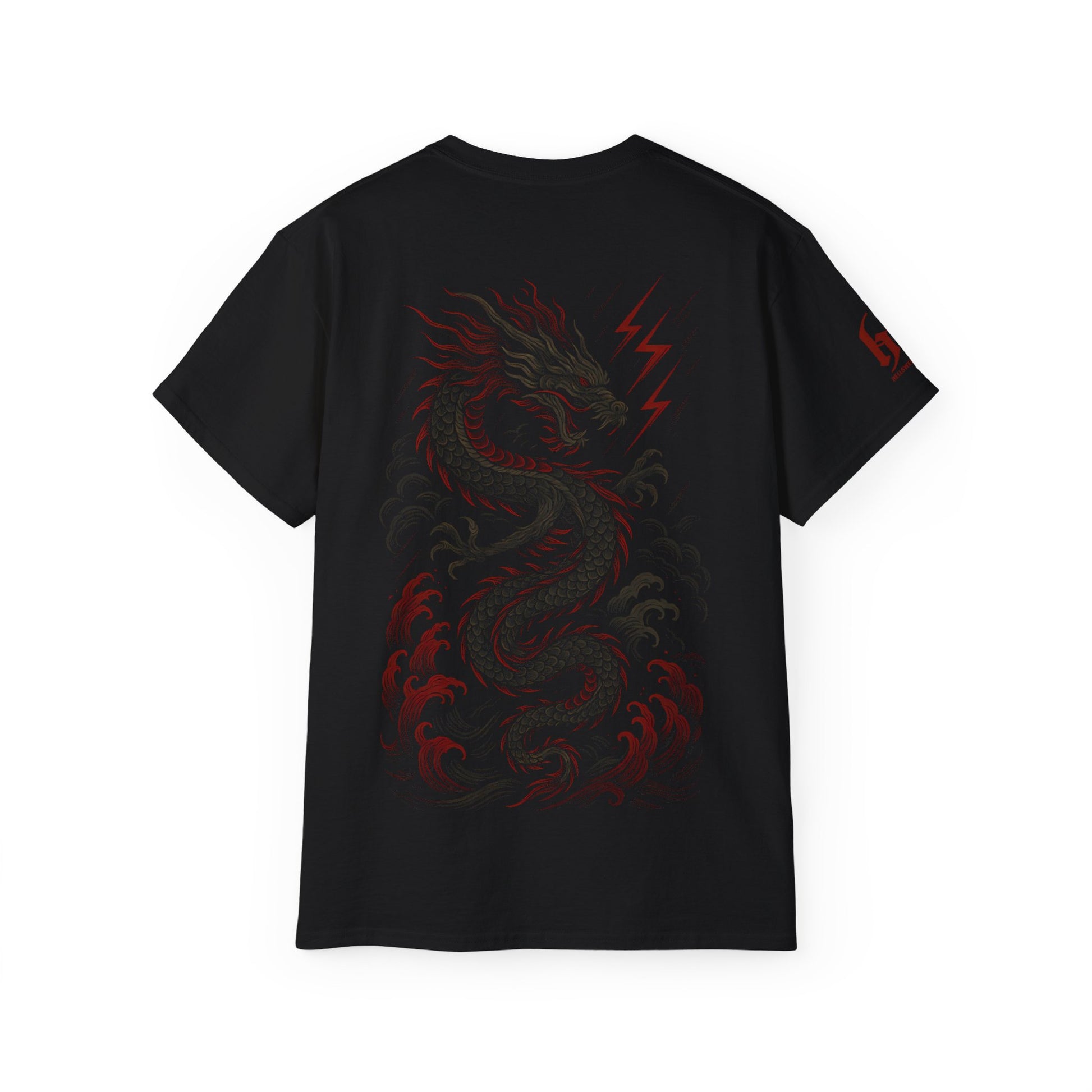 Un dragon ancestral surgit des vagues et des nuages, prêt à déchaîner la foudre. Design puissant, lignes inspirées du tattoo traditionnel japonais, pour un look dark, mystique et intemporel.