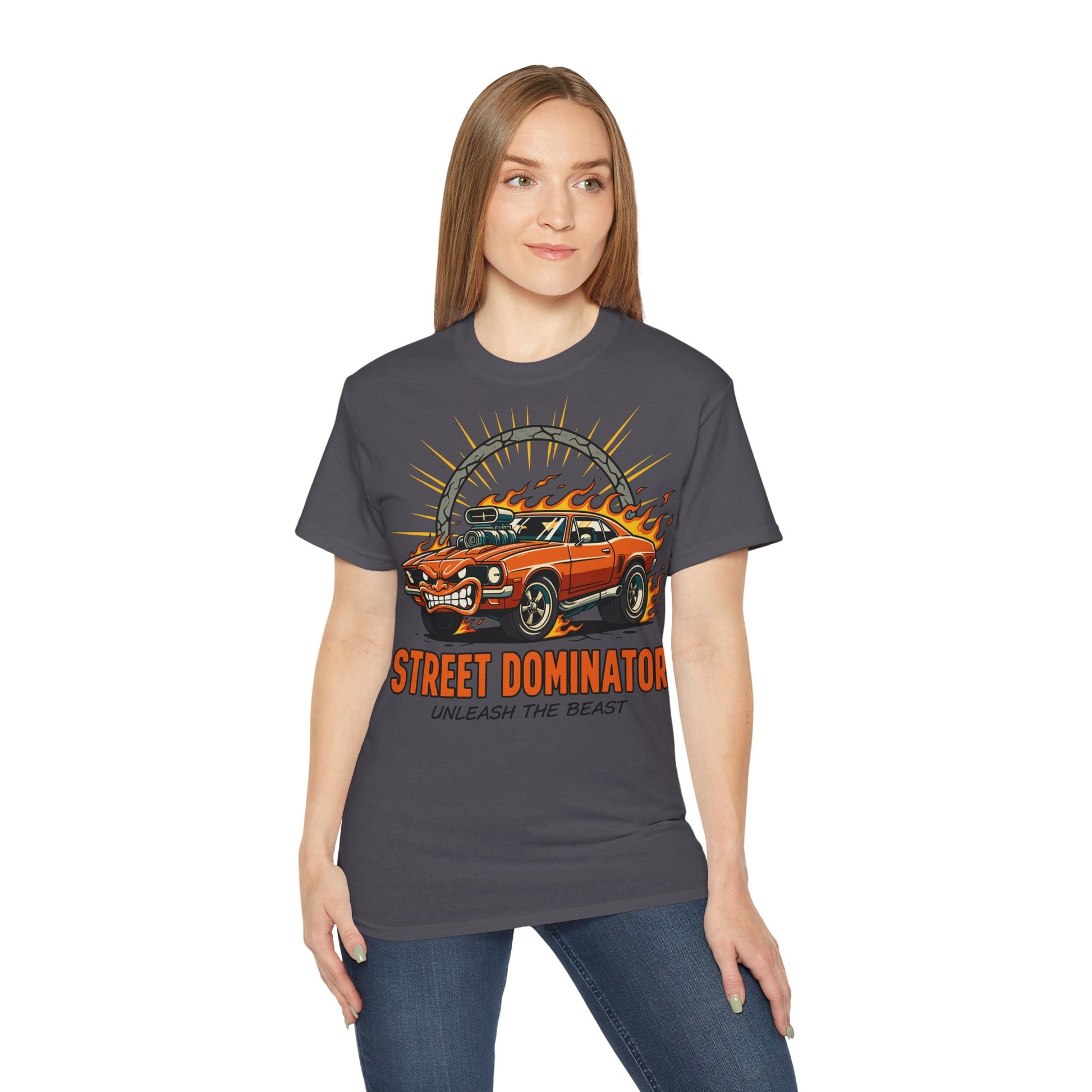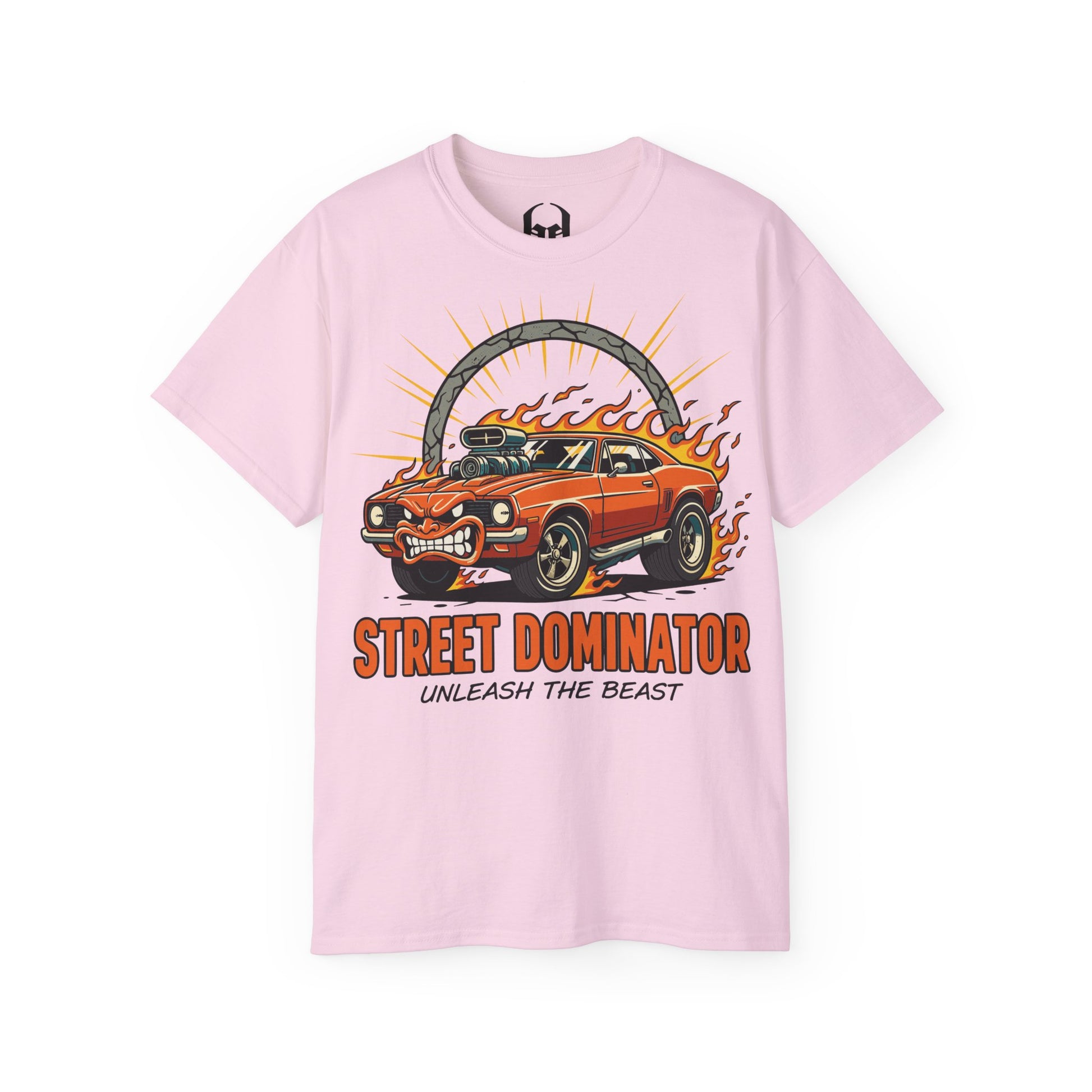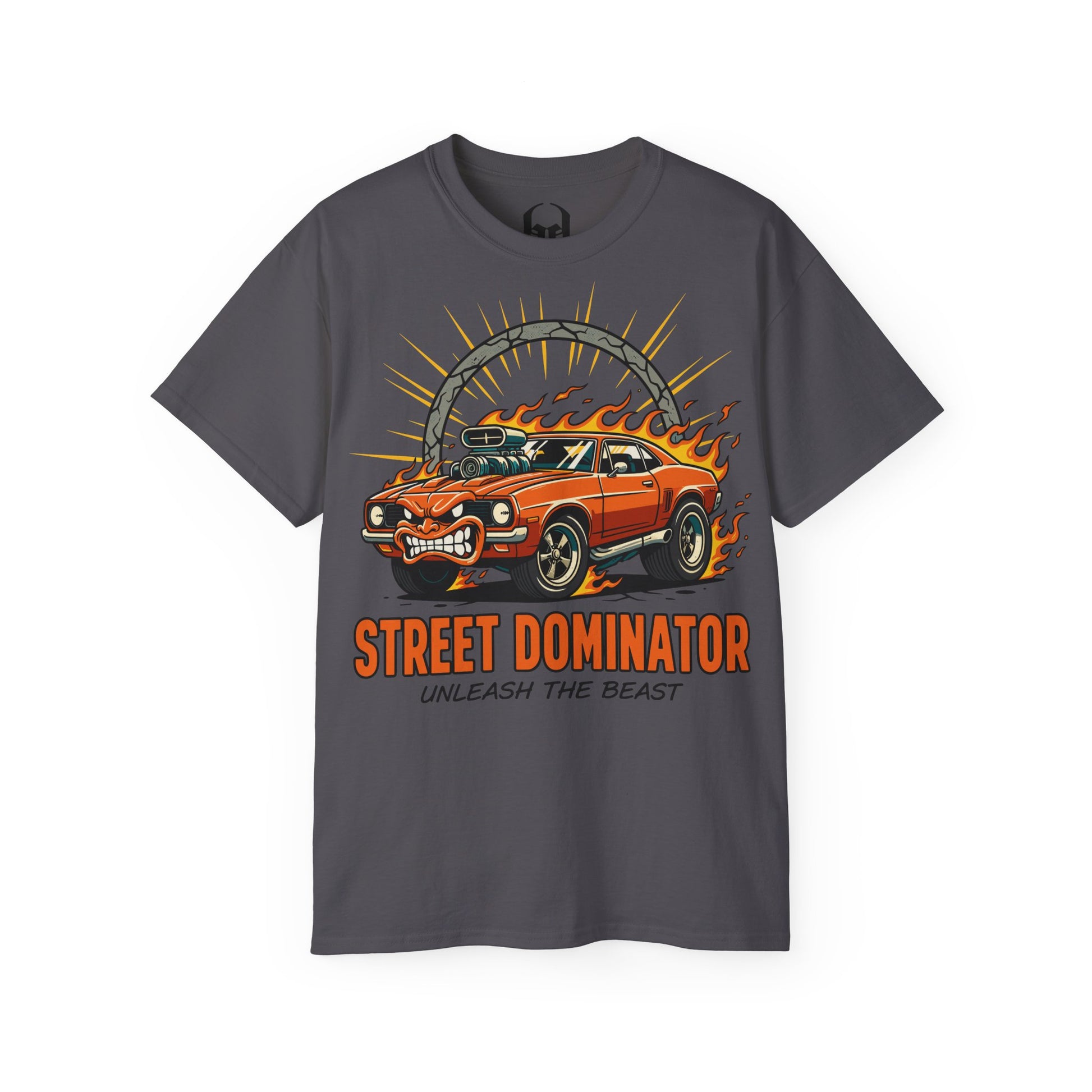 Pas de règles. Pas de limites. Juste de la gomme cramée, des flammes, et une bagnole prête à dévorer le bitume. Street Dominator, c’est la fusion entre moteur surboosté, rage pure et esthétique cartoon badass. Un clin d'œil à la culture hot rod, aux runs nocturnes illégaux et aux caisses qui hurlent plus fort que la loi. Tu veux dominer la rue ? Commence par porter le bon matos.