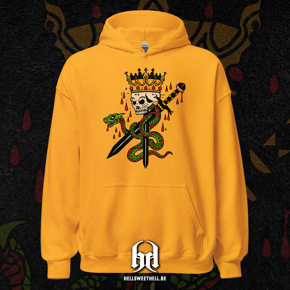 Puissance, mystère et symbolisme s'entrelacent dans ce design old school intemporel. Un crâne couronné trône fièrement, rappelant la fragilité du pouvoir et l’inévitabilité du temps. Sous lui, une dague acérée s’élève, enserrée par un serpent-dragon sinueux, incarnation de la ruse et de la renaissance. Un visuel percutant, entre royauté et menace, parfait pour les esprits rebelles et les amateurs de tatouages traditionnels.