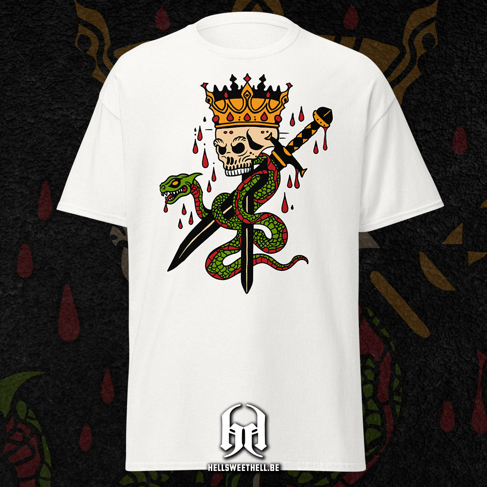 Là où le pouvoir rencontre la menace… The Crowded King capture un crâne imposant orné d’une couronne, tandis qu’une dague se dresse fièrement sous lui. Un serpent-dragon s’y enroule, entre protection et trahison, dans un style old school aux lignes affirmées. Une fusion parfaite entre royauté et obscurité, pensée pour ceux qui embrassent leur dualité.