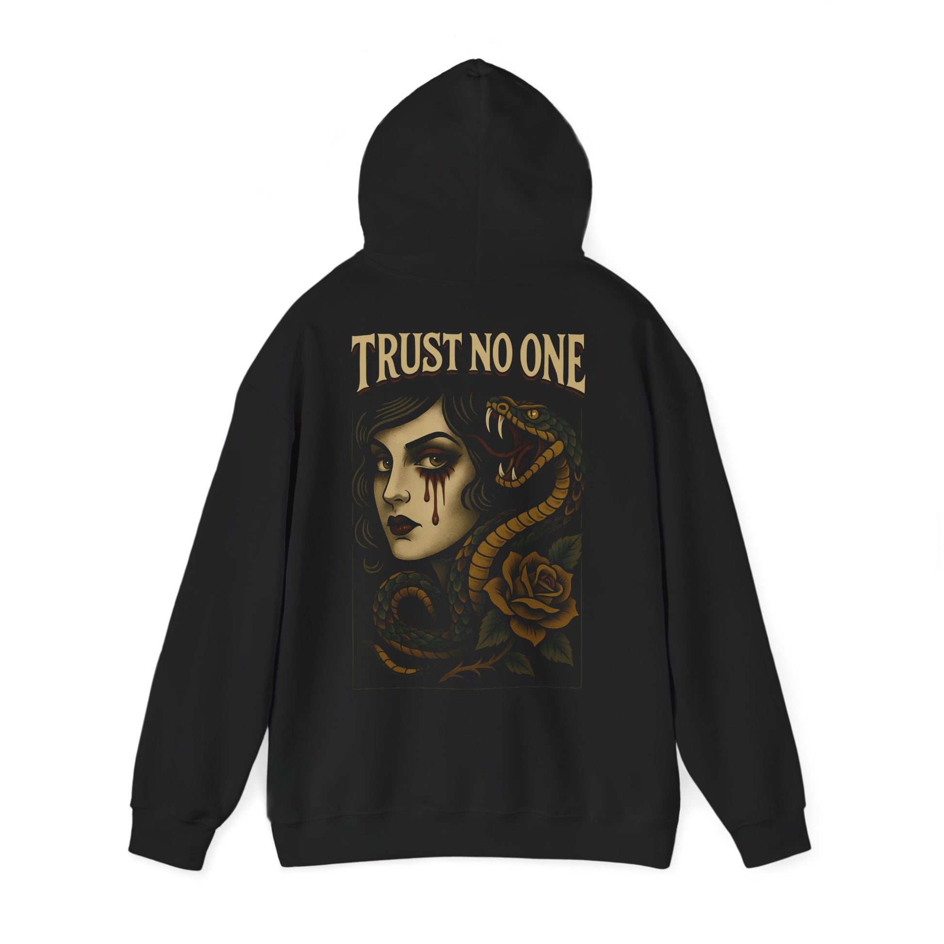 Une vérité crue : fais confiance à personne. Ce design tatouage old school mêle féminité vénéneuse et menace rampante. "Trust No One" est une déclaration, un bouclier, une cicatrice encrée sur textile. Parfait pour celles et ceux qui savent que la trahison est une langue bien trop familière.