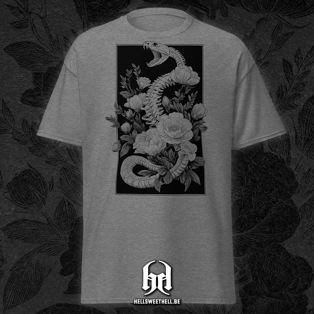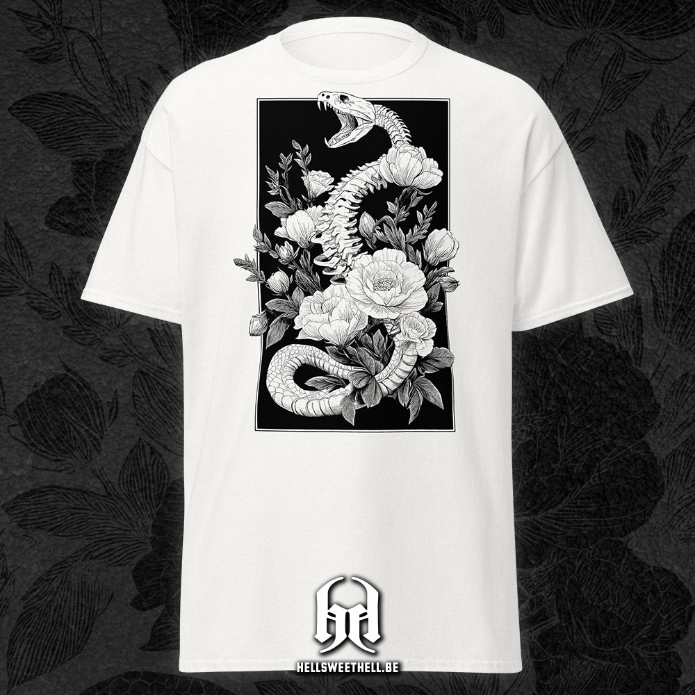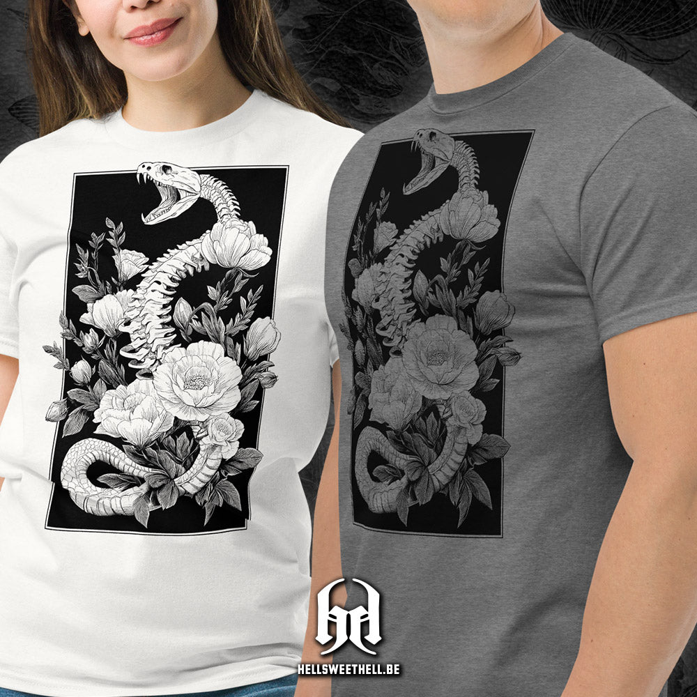 Un serpent réduit à son squelette s’enroule avec grâce parmi des fleurs délicates, créant une tension poétique entre la vie et la mort. Ce design contraste la fragilité botanique avec l’aspect brut et menaçant de l’anatomie animale, pour un rendu aussi dérangeant qu’élégant.