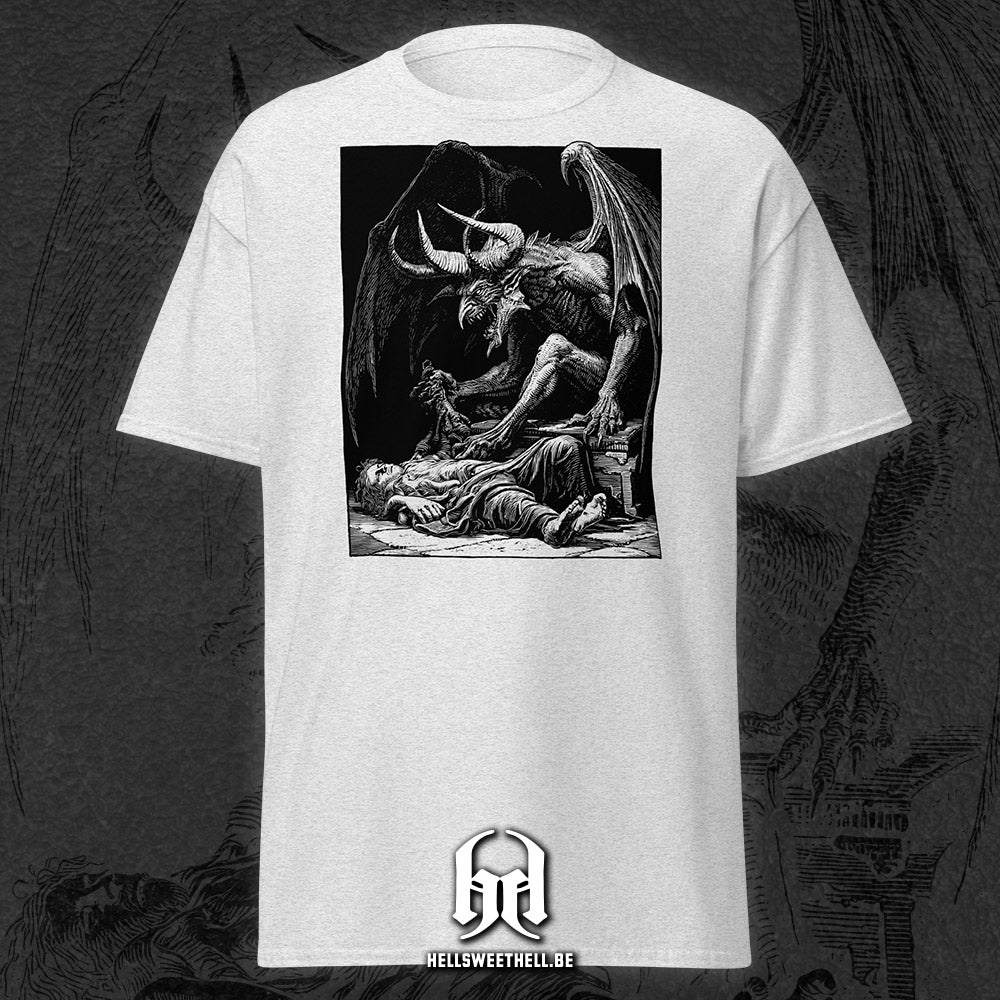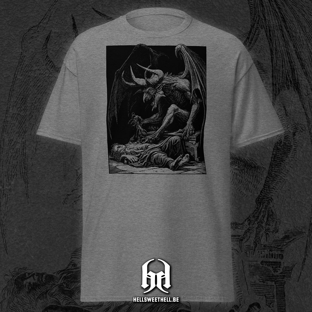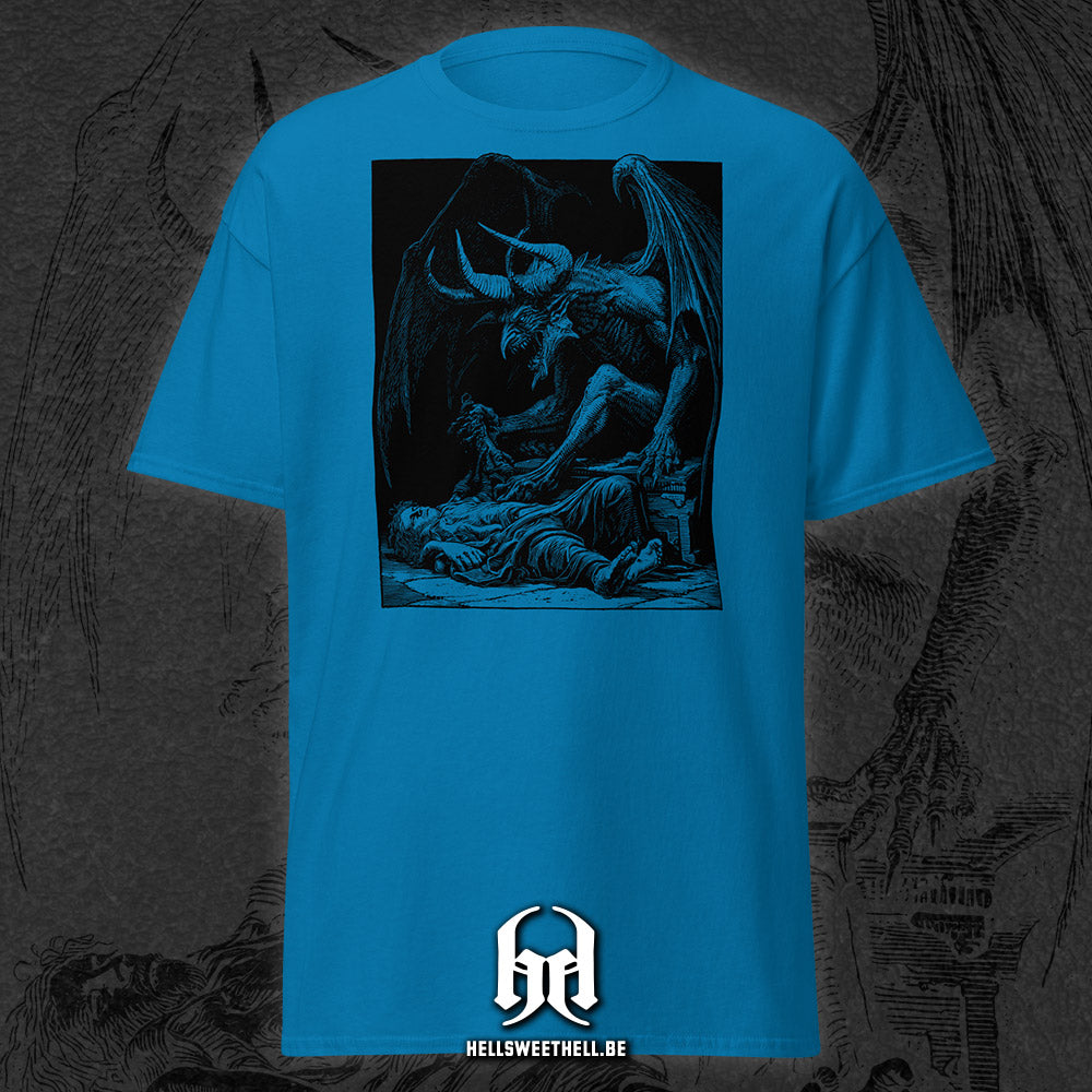 Une scène figée entre domination absolue et terreur silencieuse. "Voracious" capture un instant brut, presque sacrilège : un démon ailé, affamé, s’apprête à consumer l’essence même de sa proie. Le style gravure en noir et blanc accentue la tension, le contraste entre puissance et vulnérabilité, entre chair et ténèbres. Une œuvre sans compromis, où le désir de destruction devient art visuel. Pour celles et ceux qui n’ont pas peur d’exposer la noirceur brute.