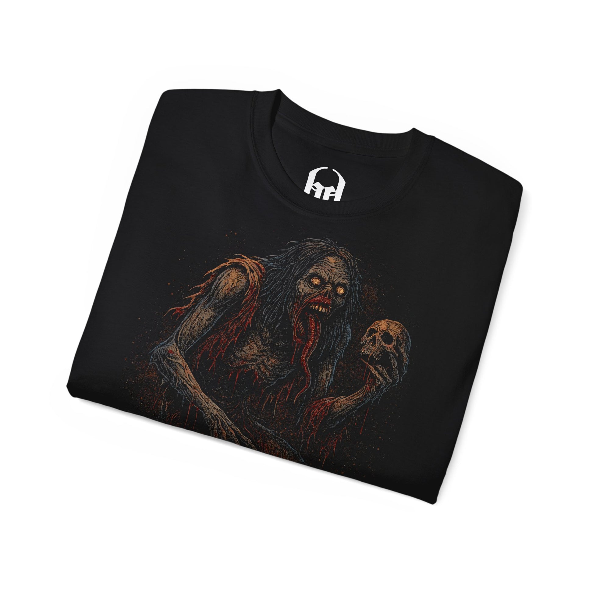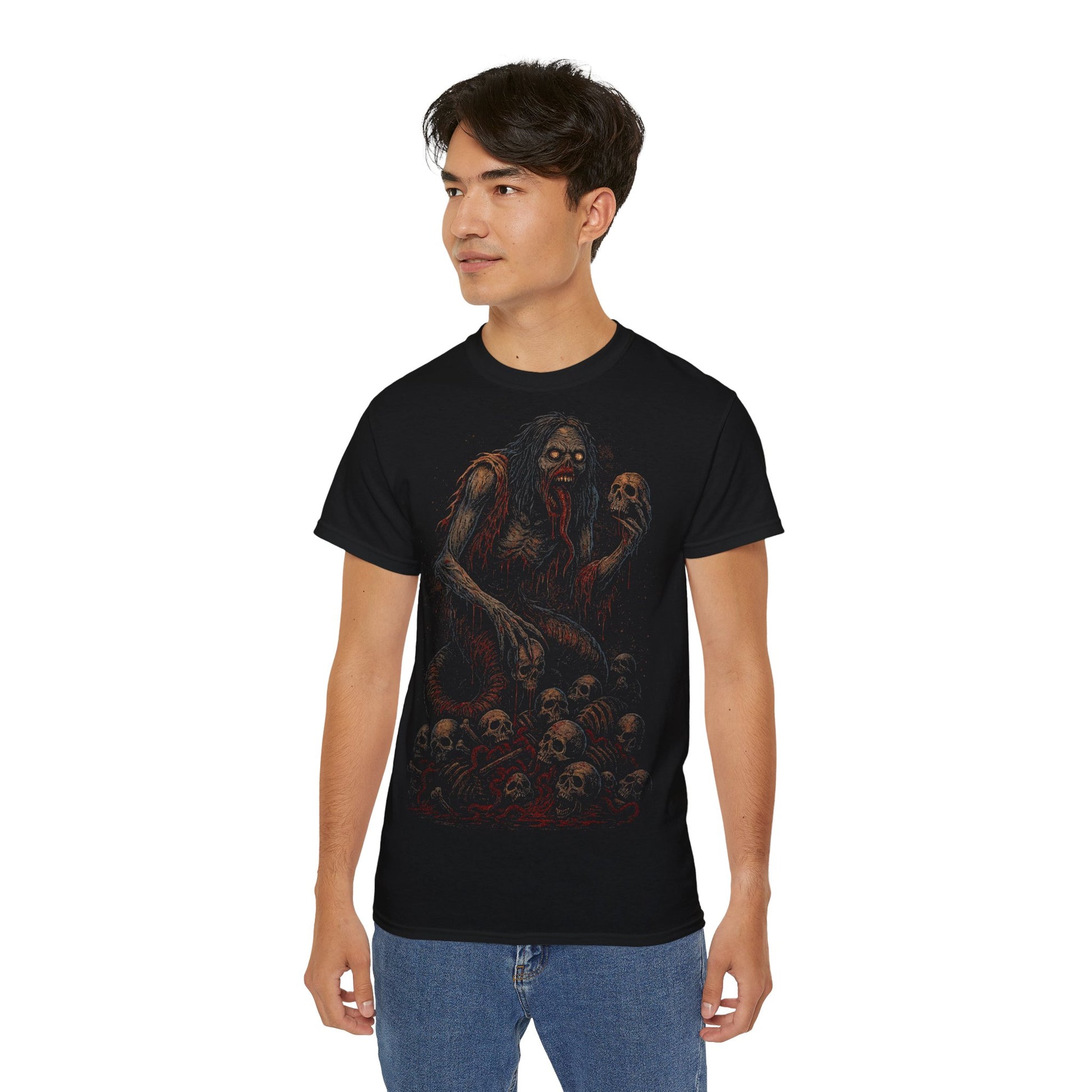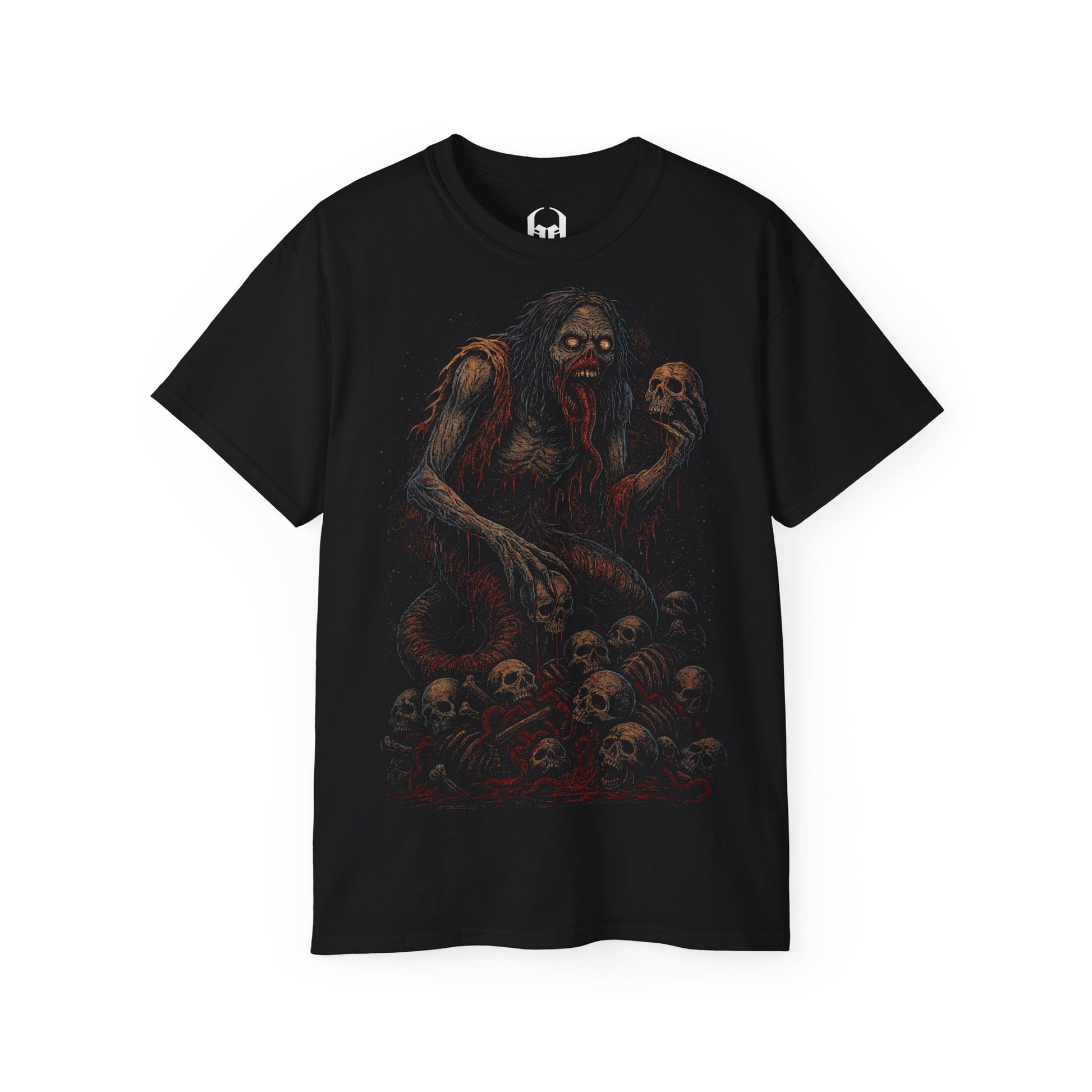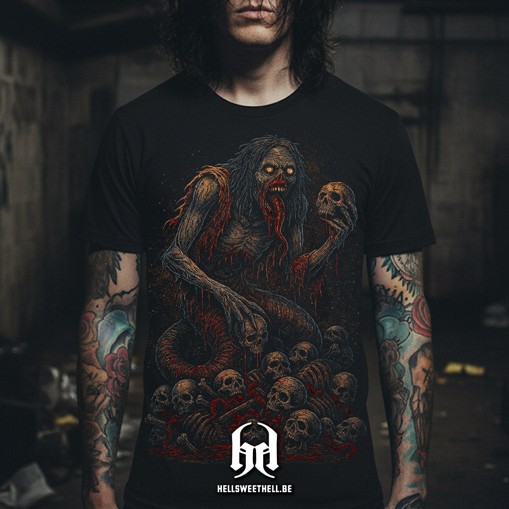Un cauchemar viscéral échappé d’un abîme sanglant. Cette créature rampante, mi-femme, mi-ver, trône sur un charnier de crânes et de restes humains, suintant une horreur antique. Chaque détail est pensé pour déranger, fasciner, et repousser les limites du bon goût.